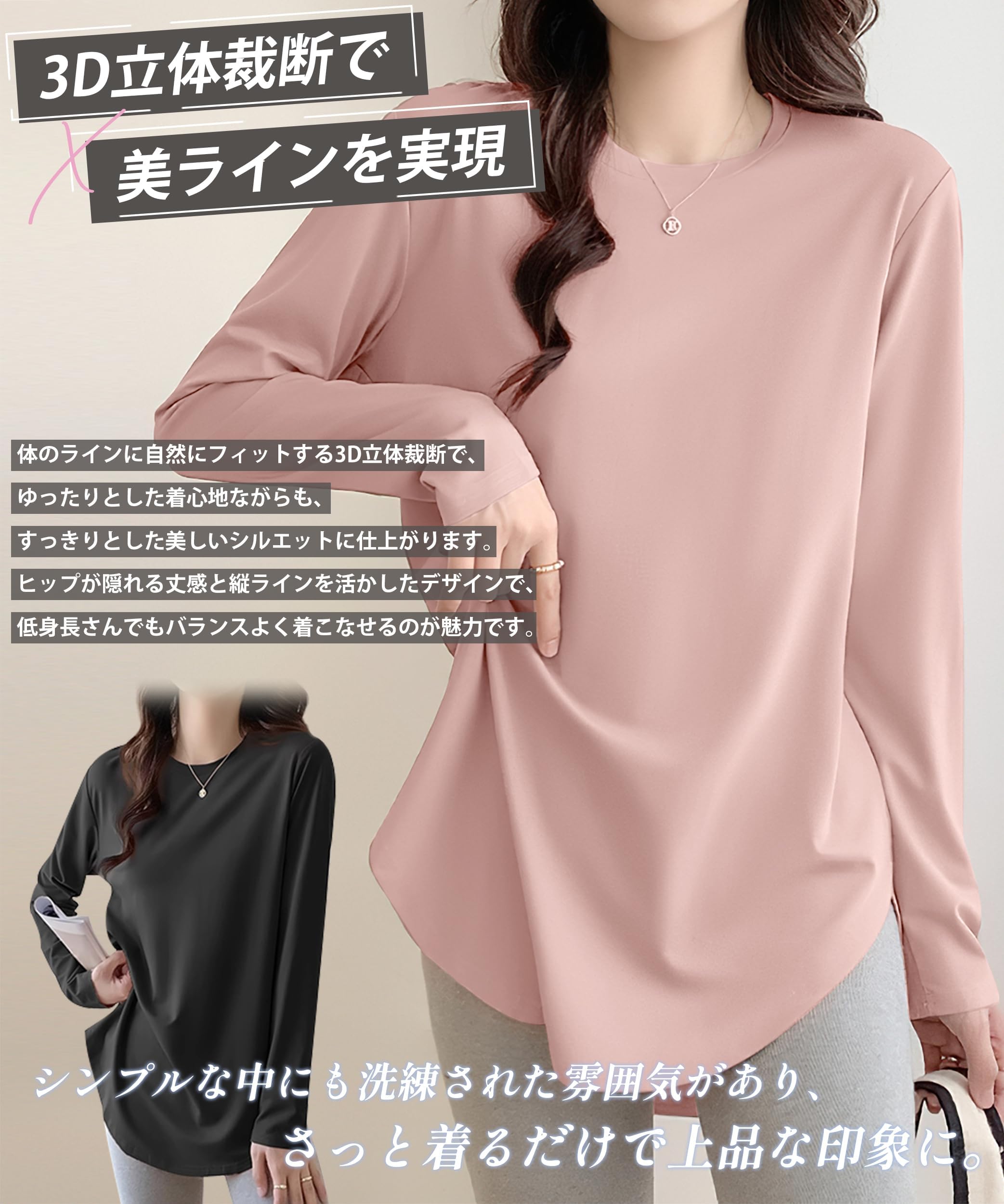* 【3D立体裁断で美ラインを実現】AOYのTシャツは体のラインに自然にフィットする3D立体裁断で、ゆったりとした着心地ながらも、すっきりとした美しいシルエットに仕上がります。AOYのTシャツはヒップが隠れる丈感と縦ラインを活かしたデザインで、低身長さんでもバランスよく着こなせるのが魅力です。シンプルな中にも洗練された雰囲気があり、さっと着るだけで上品な印象に。