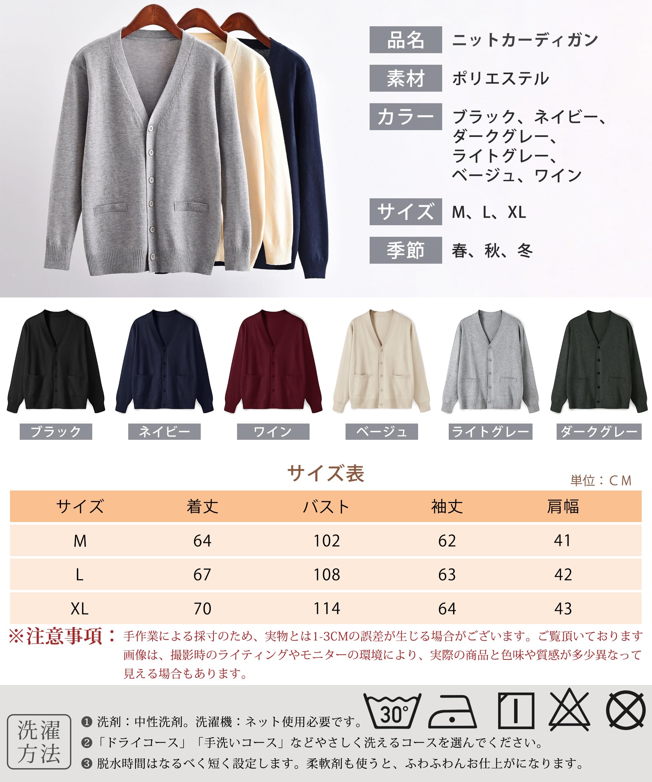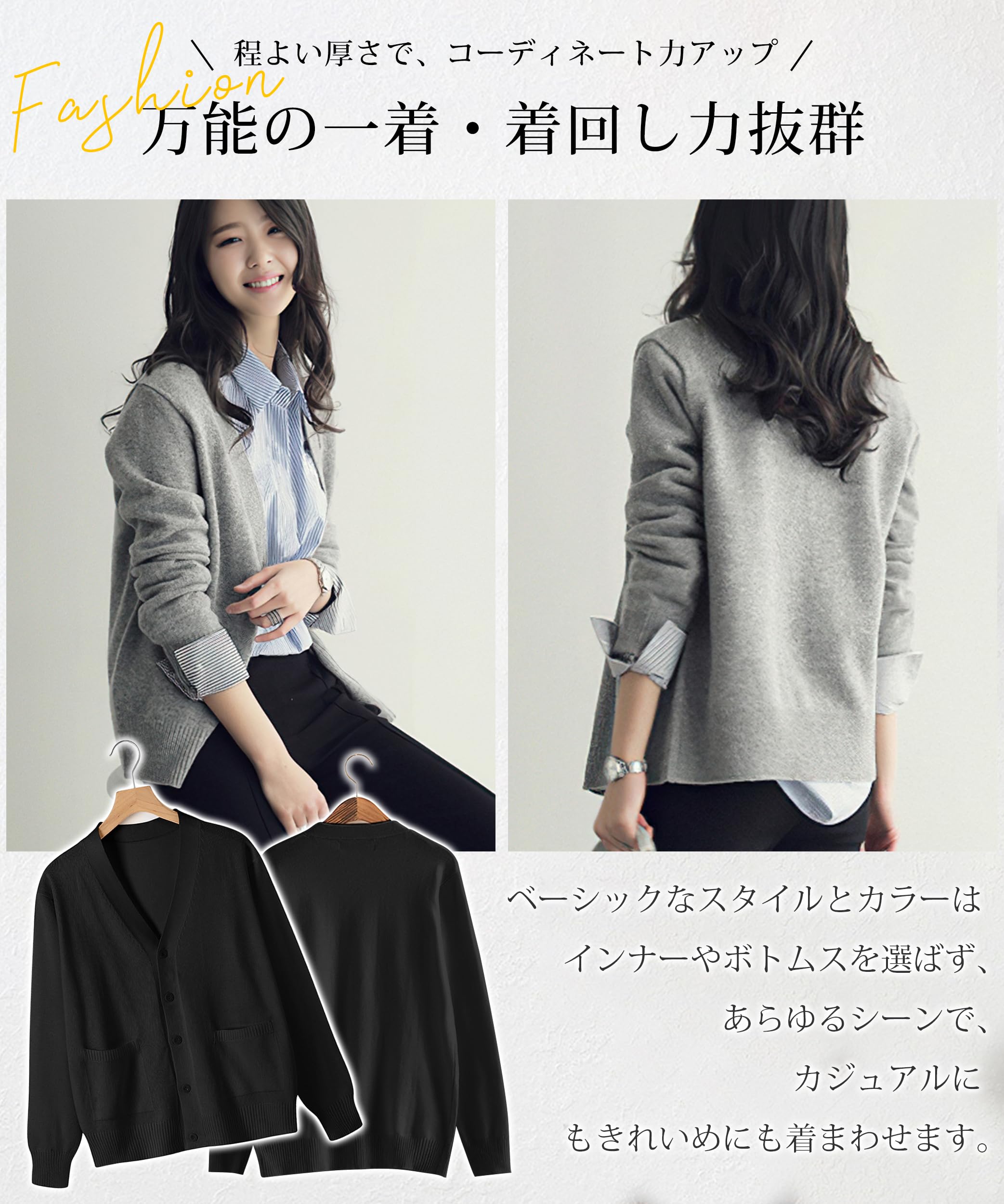 * 【幅広いシーンで大活躍】ベーシックなデザインの万能カーディガンは、年代を問わず着用できるニットウェアです。普段はもちろん、通勤、通学、お出かけ、デート、在宅、あらゆるシーンで活躍します。きちんと感のあるシンプルなデザインで、学生・女子高生の制服としてはもちろん、職場でのオフィスウェアや事務服としてもおすすめです。