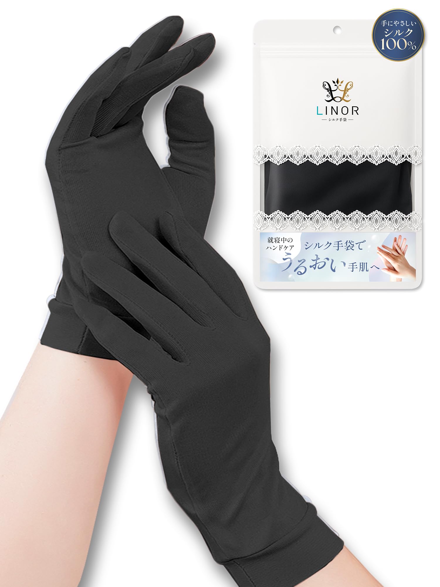 [LINOR]シルク手袋 手荒れ-手袋 寝る時 おやすみ手袋 ナイト手袋 ハンドクリーム 手袋 保湿 ハンドケア uvカット 日焼け防止 レディース シルク 100% うるおい手肌 (ブラック)