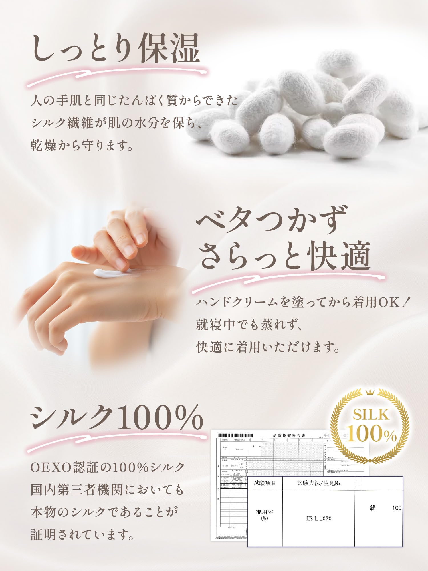 * 【シルクのやさしい肌触り】シルク 100%の 保湿 手袋 は、吸汗性・速乾性に優れ、蒸れにくく清潔で快適。お子様やお肌の敏感な方、手荒れにお悩みの方に安心して着用いただける手袋です。