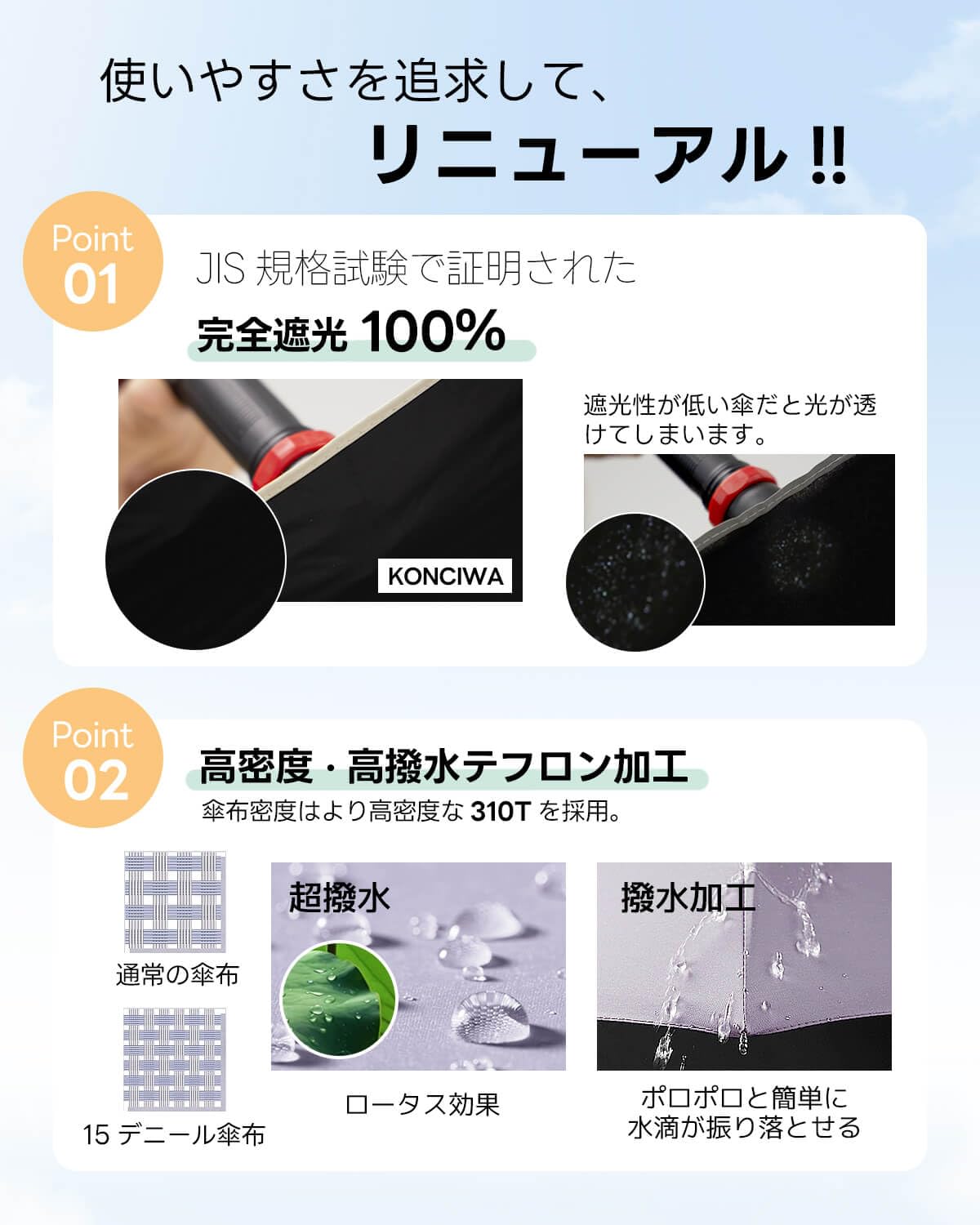 * 【晴雨兼用*耐風撥水】310T高密度の撥水加工材料で作られ、雨が珠のように丸くなり転がり落ちます。普通の傘より撥水性が優れ、軽く振るだけで雨水を振り払えます。長い間使用しても雨の染み込みが気にならなくなりました。電車内等の公共の場では人にご迷惑を掛けません。また防汚効果もあり、汚れにも強い生地です。中棒は頑丈航空機用アルミ合金製造、6本の傘骨にグラスファイバーと航空機用アルミ合金を使用しました。耐久性に優れています。強風で裏返っても元に戻ります。