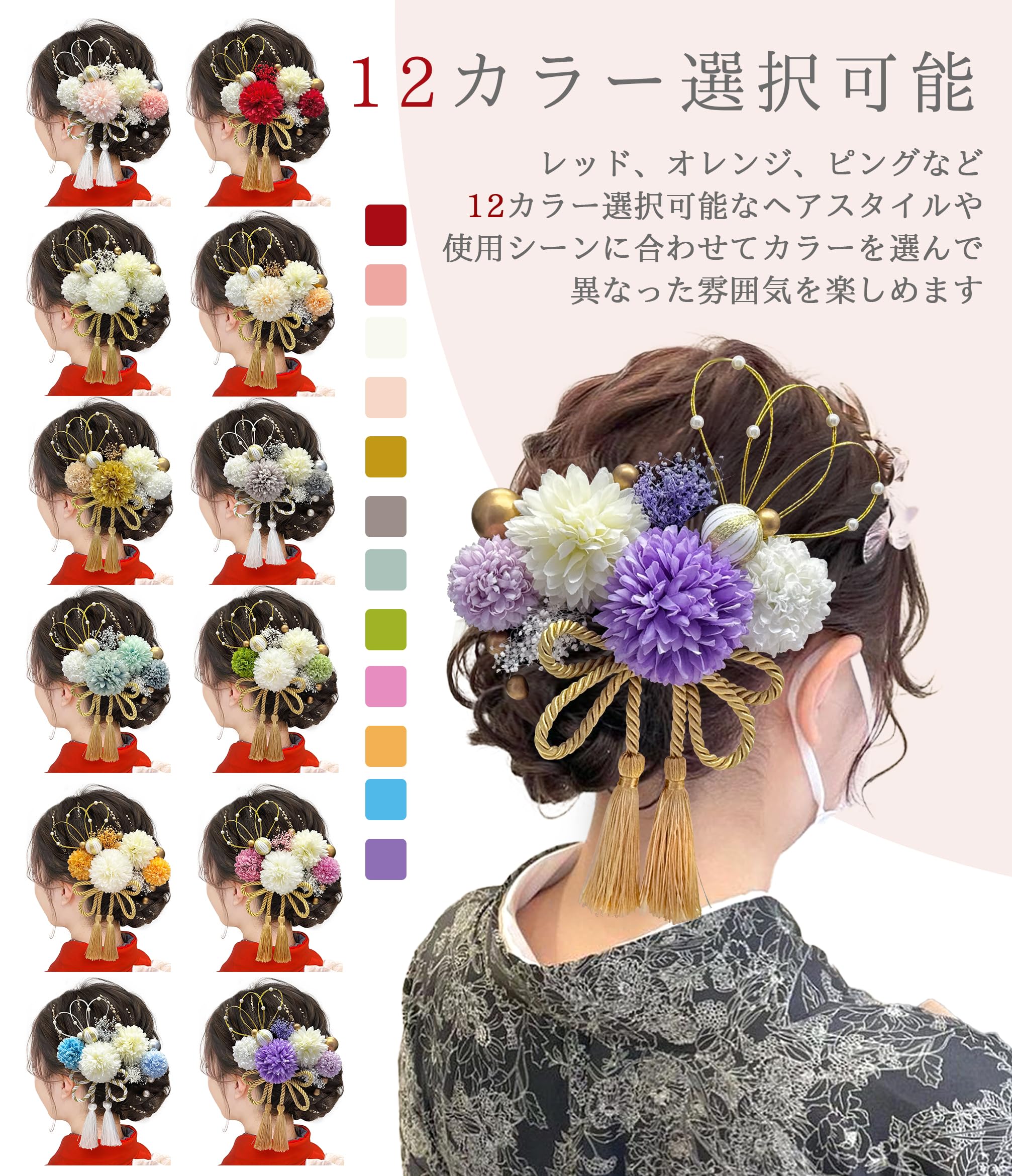 * 【ユニークなデザイン】伝統と現代の要素を融合しているデザインです。この髪飾りは金色の結び水引とかすみ草がエレガントな形に編み込まれ、アンティークベリーと和玉が間を彩っています。精緻なピンポンマムとの組み合わせが、ラグジュアリー感をプラスしています。合計12カラーが選択可能です。