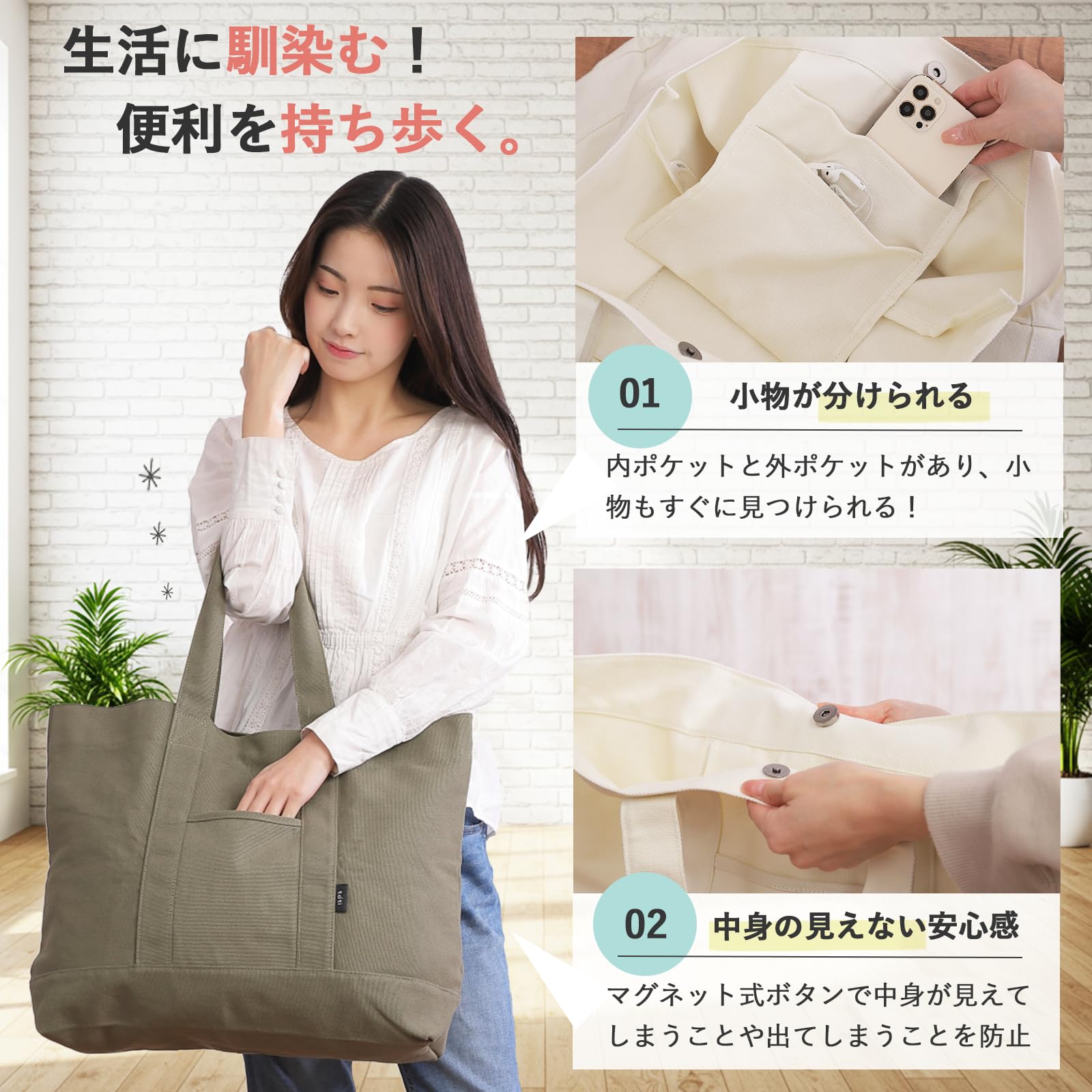 * 【容量】:約30L 【サイズ】:幅約52cm(トップ)/幅42(底辺)× 高さ約38cm × マチ約15cm 【素材】:16oz キャンバス(厚手で丈夫な生地を使用) 【ポケット】:外側オープンポケット×1、内側仕切りポケット×1 【重量】:約380g(軽量設計で持ち運びに便利) 【カラー】:ピュアブラック、オフホワイト、ダークベージュ、ダスティオリーブ(全4色) 【用途】:お買物、小旅行、部活、アウトドア、マザーズバッグなど幅広いシーンに対応 【特徴】:メンズ レディース 兼用、耐久性抜群の軽量キャンバス素材、荷物を整理しやすいポケット付き