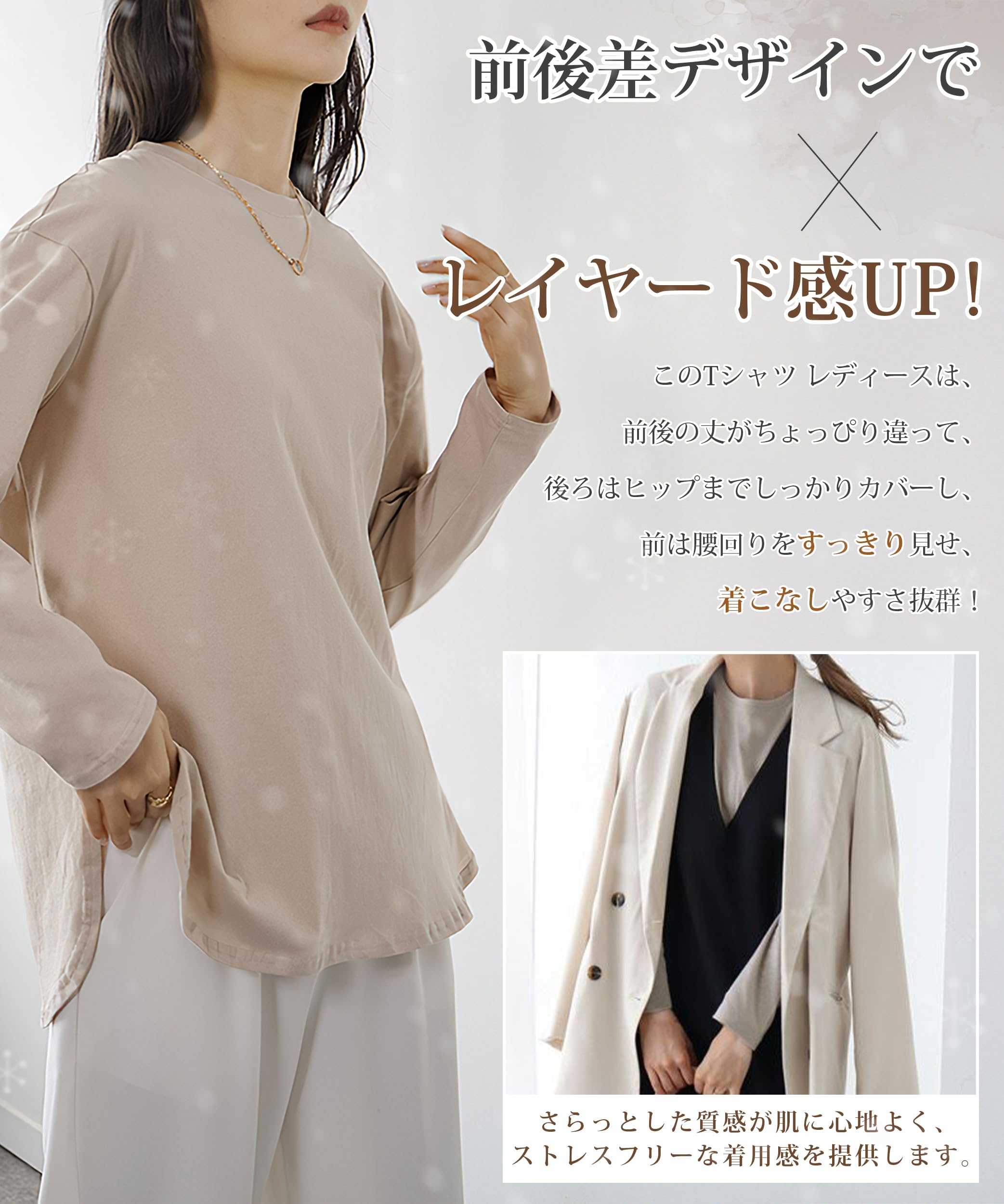* 【前後差デザインでレイヤード感UP】このTシャツ レディースは、前後の丈がちょっぴり違って、後ろはヒップまでしっかりカバーしてくれるのに、前は腰回りをすっきり見せ、着こなしやすさ抜群!高めのアーチ型裾とラウンドヘムが、裾がきつくなる心配もありません。 一枚着てもふんわりとしたレイヤード感をプラス!スウェットやセーターとの重ね着にも縁がアクセントとなり、スタイルアップ。シンプルなシルエットがスムーズになり、身幅はゆとりがあり楽な着用感を与え、細身効果も引き立ちます。ドロップショルダーのデザインは、デニムやワイドパンツなどのカジュアルアイテムとの相性抜群、リラックス感たっぷりのTシャツ レディース。体型を選ばず、自然な美しいラインを作り出し、重ね着ときに最適なTシャツ レディース。