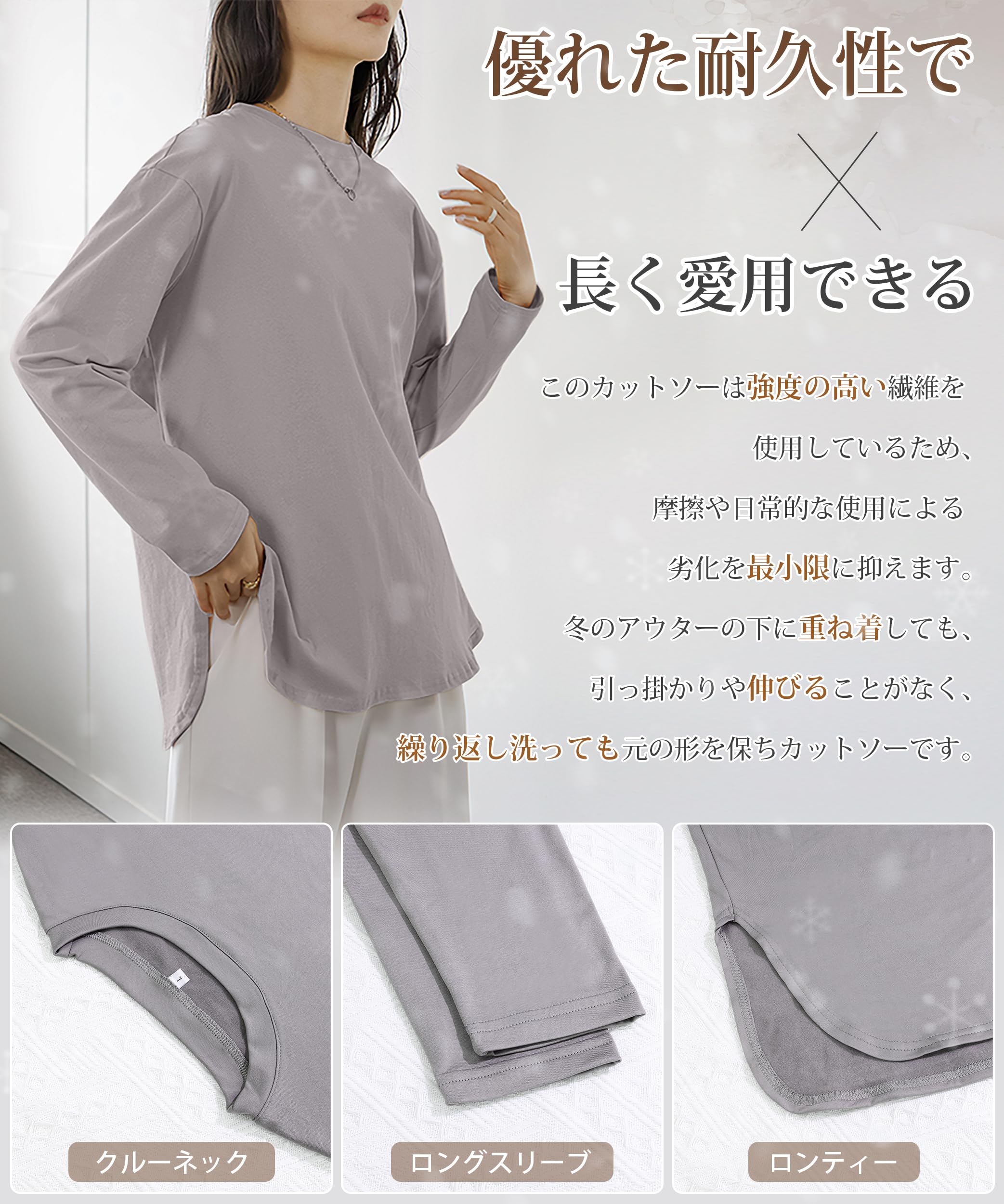 * 【万能で着回し力抜群の冬の欠けない】このティーシャツは、カジュアルな日常やお出かけにも簡単に合わせられ、冬のインナーとして大切な一枚です。アウターを羽織ってももこもこしづらく、いろいろなコーディネートで着用いただけます。オフィス、通勤、通学、女子会、デート、ママ友との食事会、学校行事、在宅勤務、リモートワーク、旅行先など様々なシーンで大活躍なティーシャツです。【サイズ】● M 身丈(前) 70cm、身丈(後)73cm、袖丈 51cm、肩幅49cm、バスト55cm、袖口幅10cm;L 身丈(前) 71cm、身丈(後)74cm、袖丈 53cm、肩幅 51cm、バスト59cm、袖口幅 11cm;XL 身丈(前) 72cm、身丈(後) 75cm、袖丈 53cm、肩幅 53cm、バスト 62cm、袖口幅 12cm;※サイズは平置き採寸です。多少の誤差がある場合がございますのでご了承下さいませ。