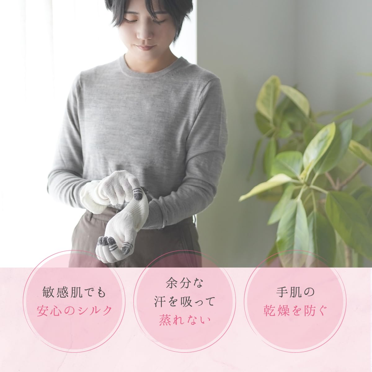 * 【シルク100%のスマホ手袋で、乾燥肌も便利に保湿】冬の乾燥や、日々の家事等による手荒れ。 シルク100%の手袋で、寝ている間もしっかり保湿。 スマホ操作ができる導電糸を使っているので、 普段使いに大変便利です。