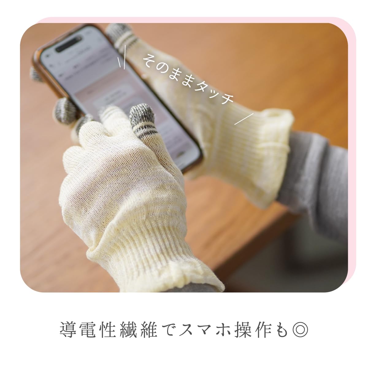 * 【指先の導電糸でらくらくスマホ操作】手袋の指先に電気を通す導電糸を使用し、指と同等の静電的な導電性をもたせることで、タッチパネル操作が可能な手袋となりました。