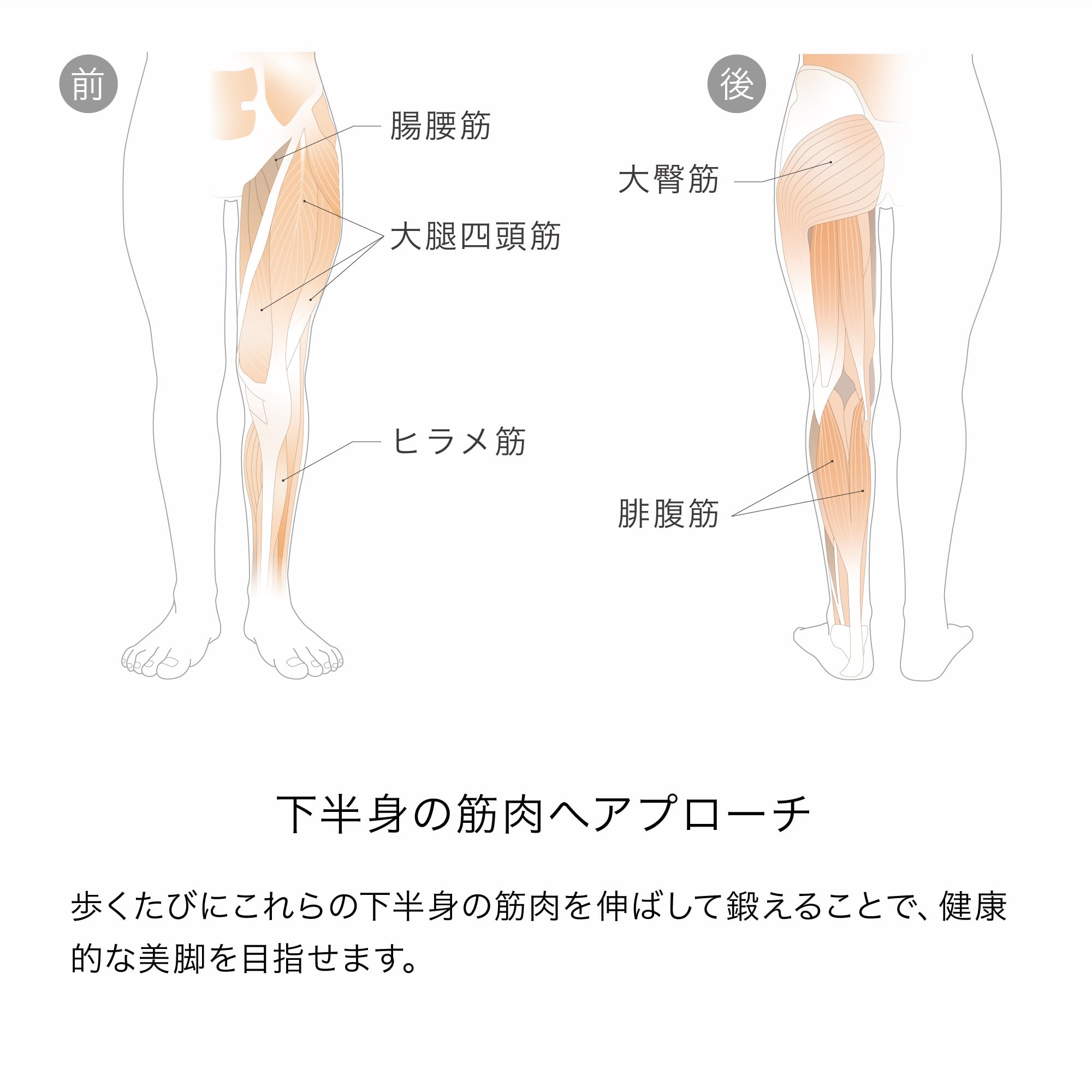 * ③下半身の筋肉へアプローチ KAMOLEGが着目したのは、「ふくらはぎ(腓腹筋)」「太もも(大腿四頭筋)」「足を振り上げるインナーマッスル(腸腰筋)」「お尻(大臀筋)」の4つの筋肉。歩くたびにこれらの下半身の筋肉を伸ばして鍛えることで、健康的な美脚を目指せます。
