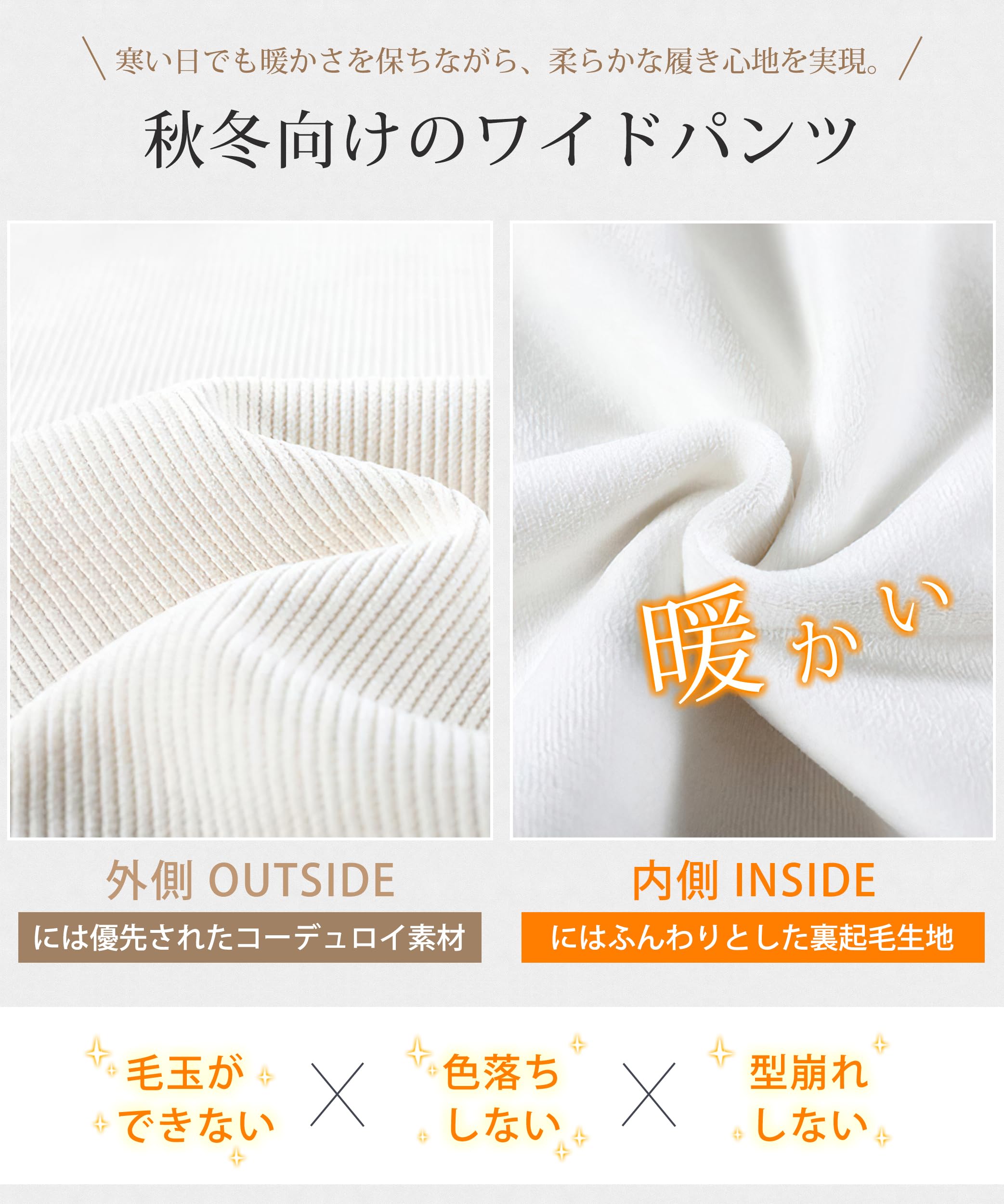 * 【裏起毛で暖かい・柔らかな履き心地】この裏起毛パンツは、寒い季節にぴったりなアイテムです。外側にはコーデュロイ素材を使用し、内側はふんわりとした裏起毛生地で仕立てられています。この組み合わせにより、寒い日でも暖かさを保ちながら、柔らかな履き心地を実現していたレディース ワイドパンツます。肌に優しい触感で、長時間の着用でも快適さを保てるのが魅力です。