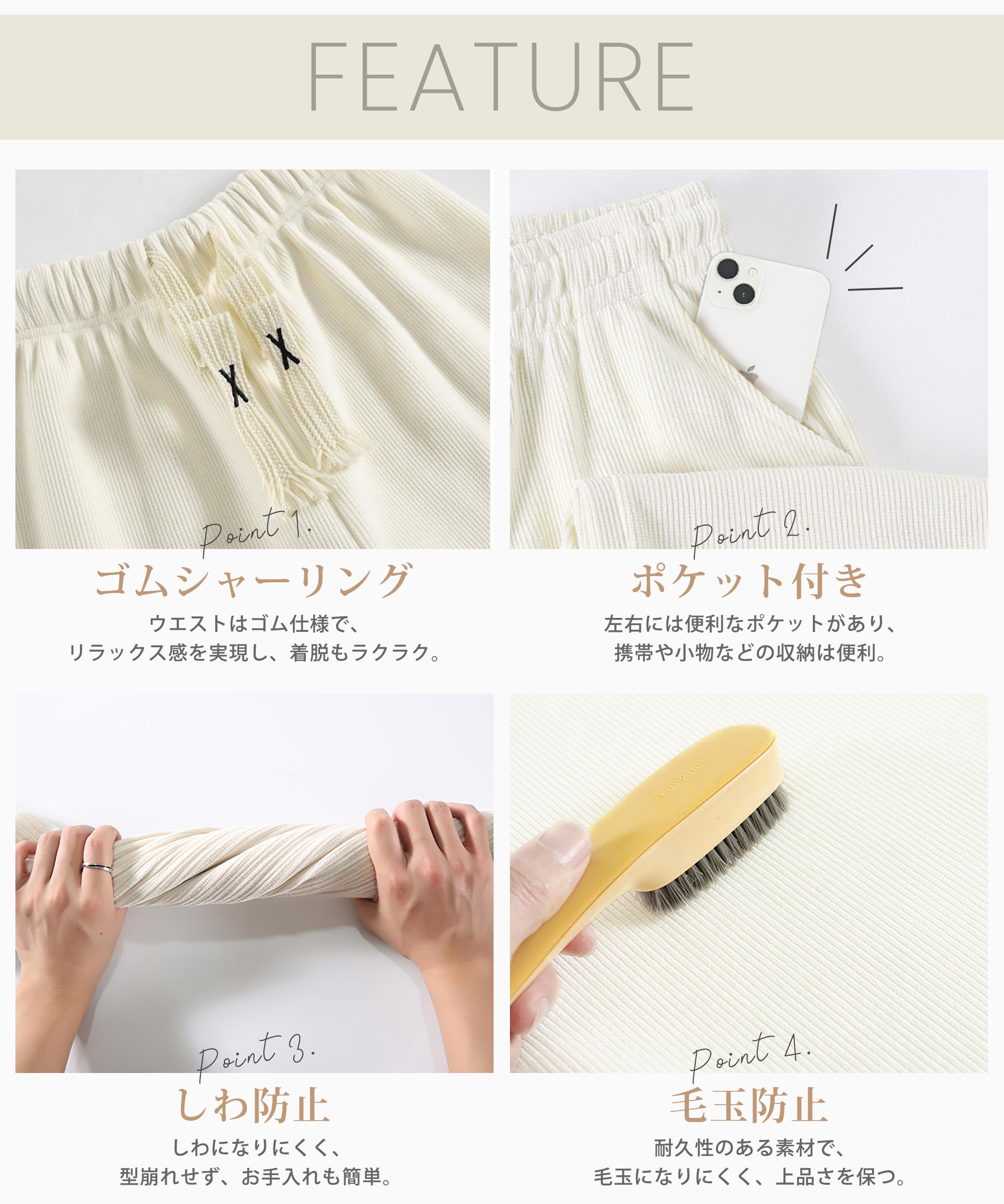 * 【絶妙なデザインで美脚効果実現】このワイドパンツは絶妙なゆったり感があり、着膨れすることなく、脚の気になる部分をさりげなくカバーします。脚を長く見せるスタイルアップに寄与し、自信を持って着こなすことができます。このワイドパンツはスリムなシルエットと高めのウエスト位置が脚を引き締める印象を与え、リブの縦ラインが視覚的な効果を生み出します。これにより、さらなる脚長効果や体型カバーが実現します。