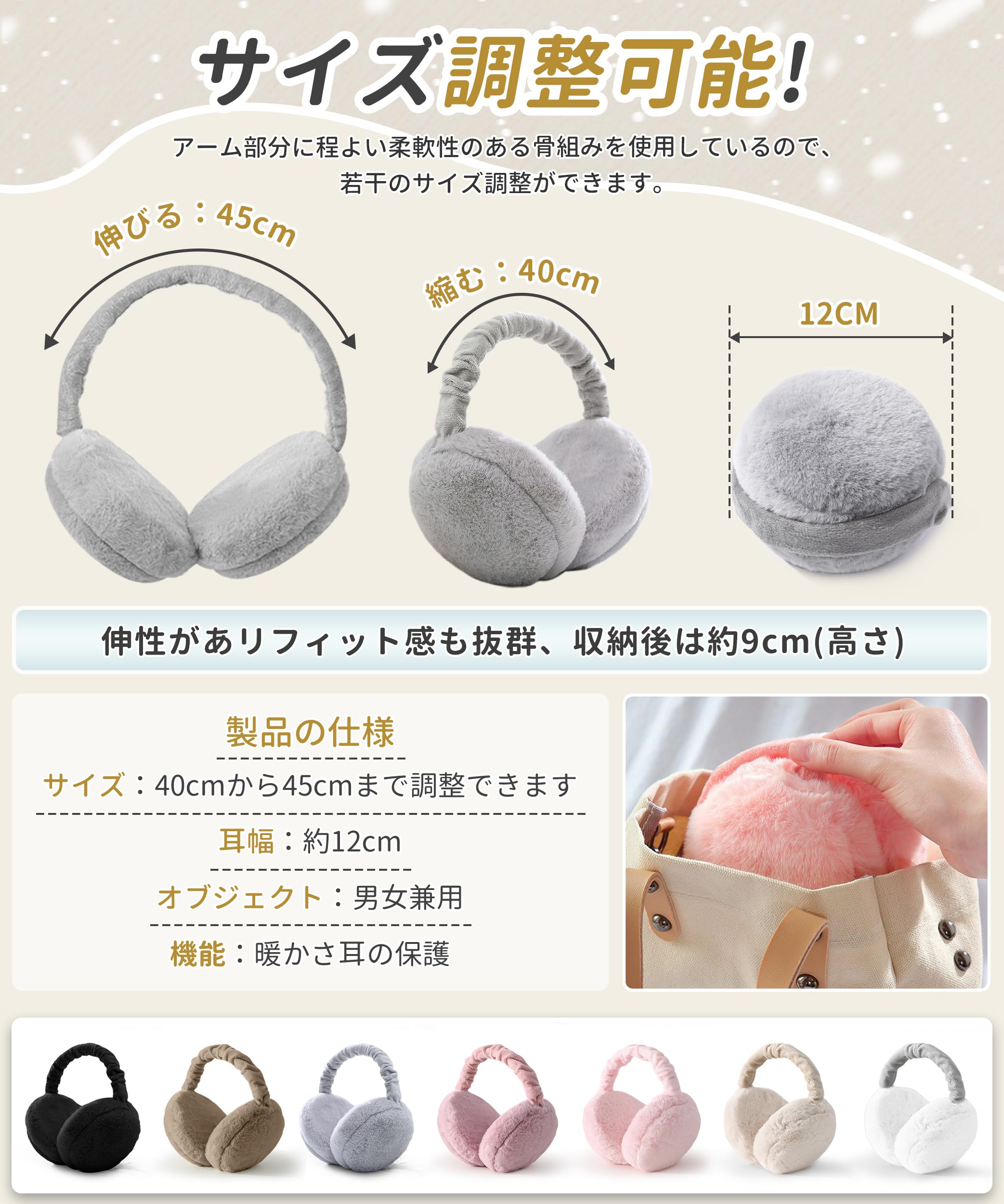 * 【サイズ調整可能・耳が痛くない】推薦頭周り:55~59cm(調節可能)。頭周りを測定することをお勧めします。 イヤーウォーマーのマーム部分には柔軟なスライドレール式骨組みを採用し、頭の大きさに合わせて40cmから最大45センチまで伸ばすことが可能です。このイヤーマフはほとんどのアジア人女性に適しており、頭の頂部あるいは後部にも掛けられます。ふわふわのイヤーマフに輪郭をつけることでスタイル良く仕上げています。また、イヤーマフの内側にはとても柔らかくし、耳に締まらず、耳に対する圧迫感を軽減、長時間の着用でも痛くありません。