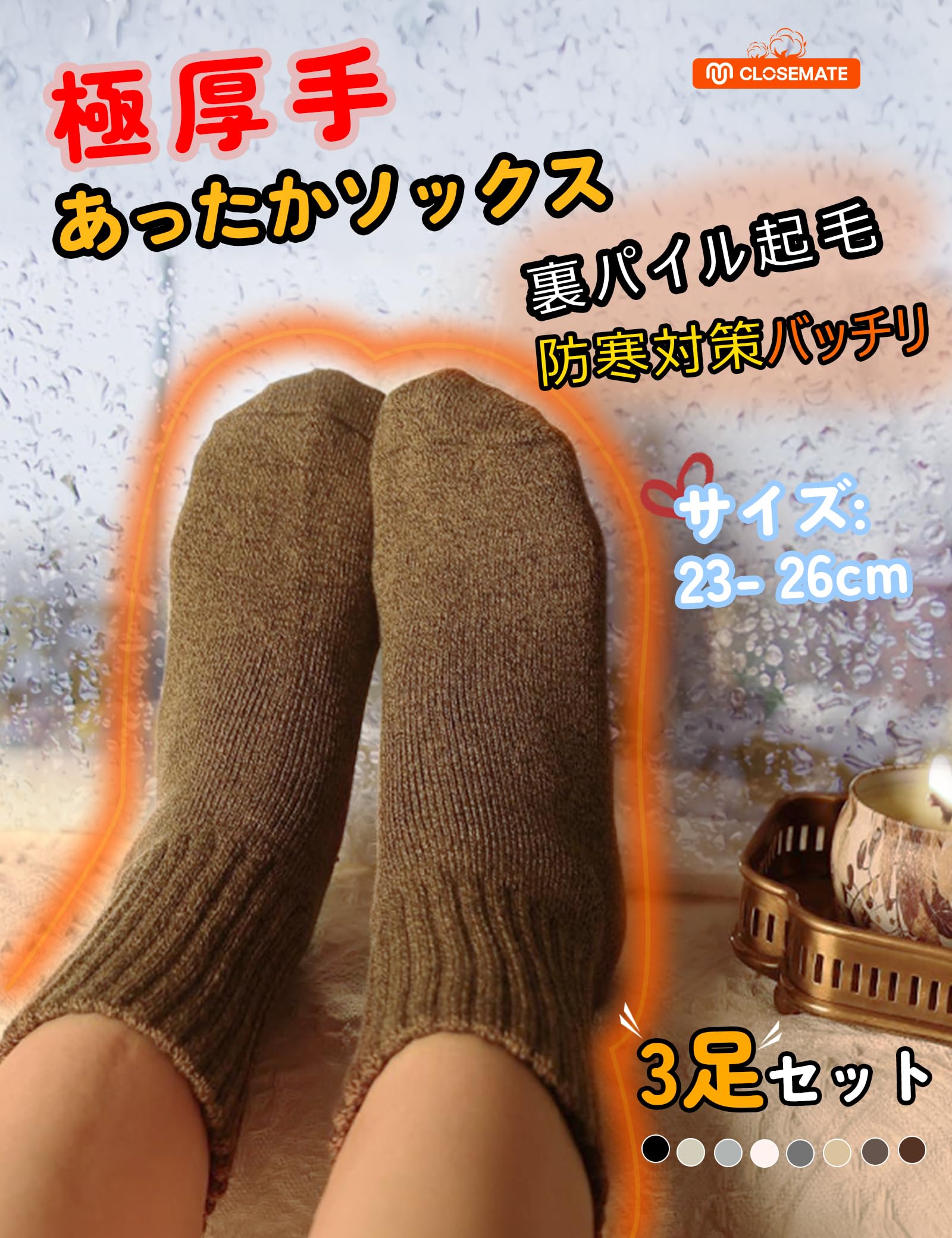 [CLOSEMATE] 靴下 レディース クルーソックス 厚手 裏パイル 暖かい 通気防臭 口ゴムゆったり ルームソックス 冷え対策 あったかい 吸汗速乾 蒸れない 無地 プレセント 3足入り 秋冬
