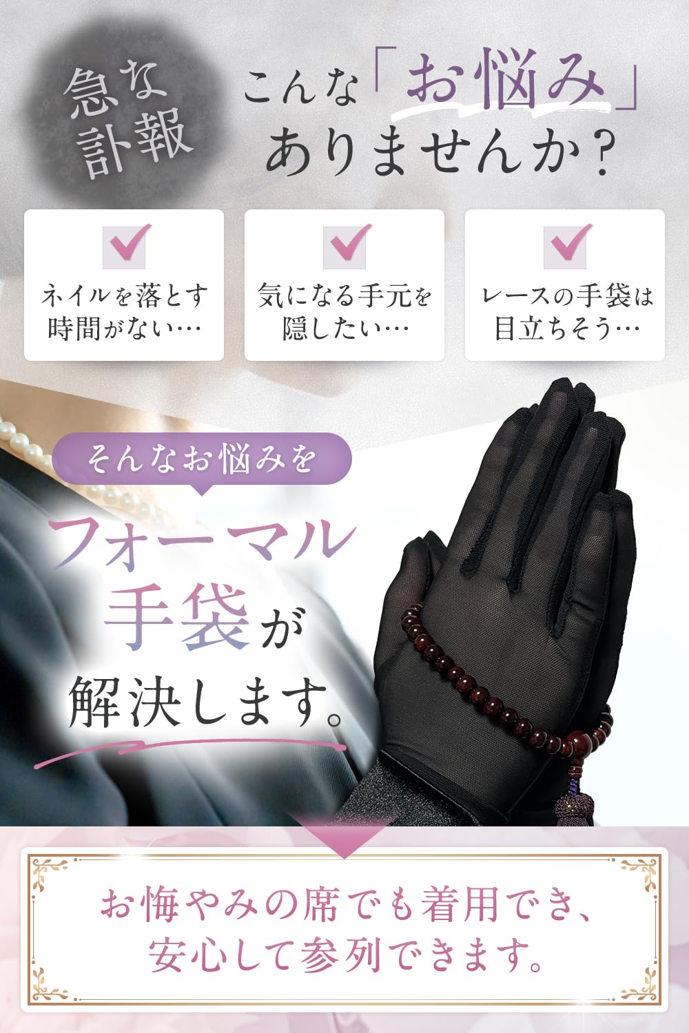 [心愛箱] 【ネイルが目立たない】フォーマル手袋 レディース 葬儀用 ブラックフォーマル 無期限メーカー保証 [葬式ガイド付属]