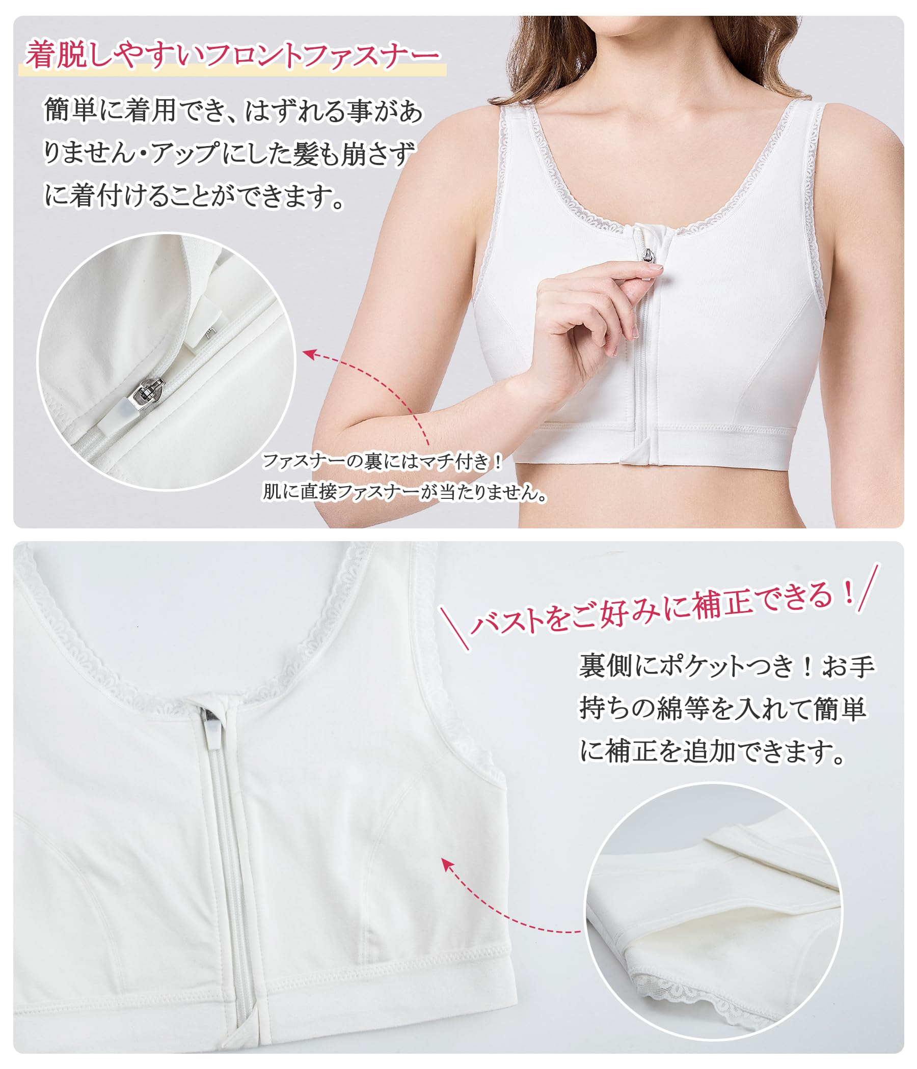 * 【フロントファスナーで簡単着脱】和装ブラジャーに配置されたファスナーは、簡単に着脱が可能です。肌に直接触れないよう、ファスナーの内側にはパッド布を装着。また、ファスナーの上下にはカバーデザインを採用し、肉を挟みにくく、着用時の痛みを軽減し、肌を守ります。