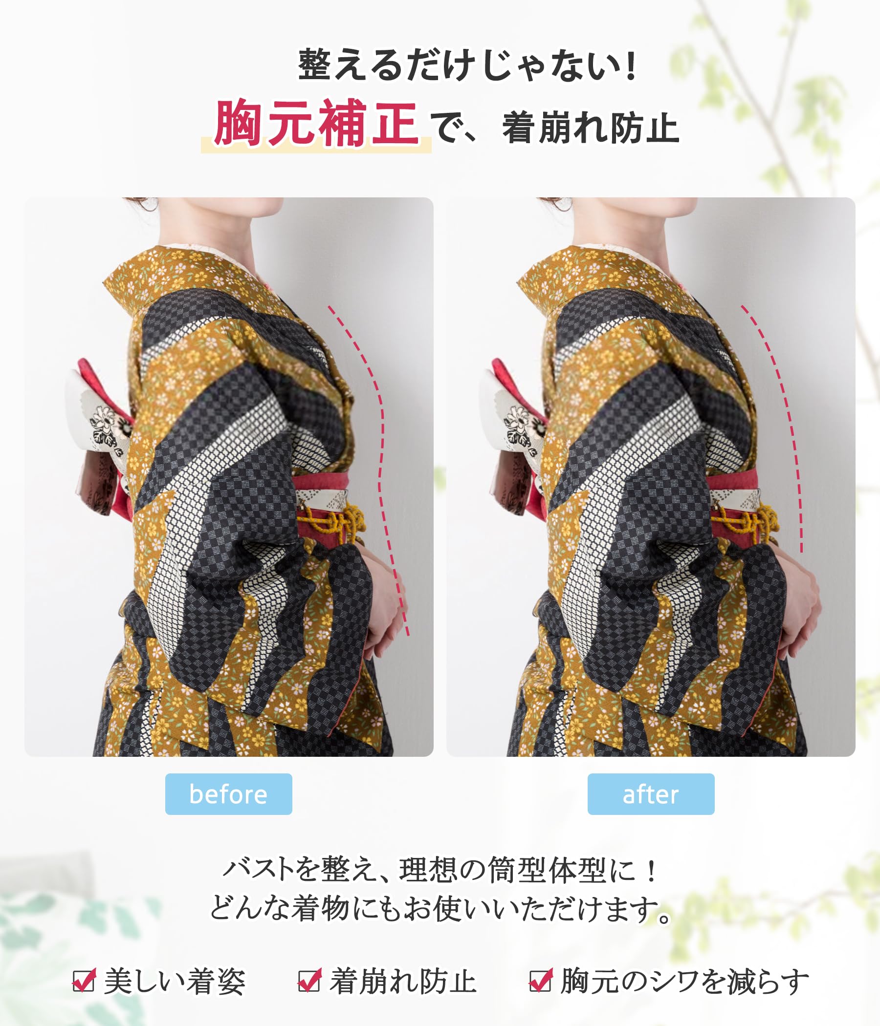 * 【加幅下帯デザイン】着物肌着の下帯が広くデザインされており、和服の帯との連携をスムーズにし、胸をスリムに見せる効果があります。取り外し可能なパッドで、個々のニーズに合わせて調整が可能です。