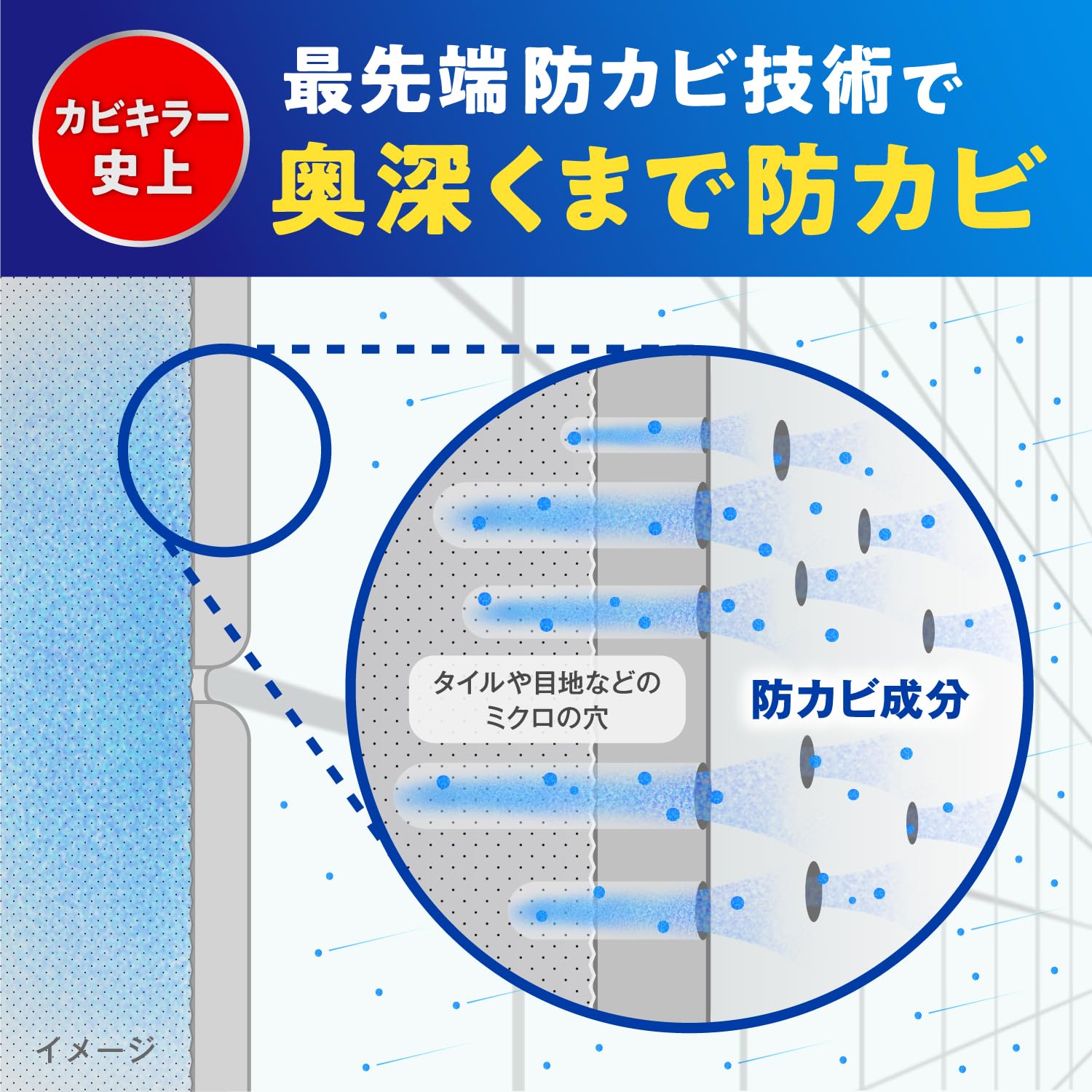 * カビキラー史上最先端の防カビ技術で、タイル目地等の小さな穴(細孔)や狭い隙間の奥に潜むカビ菌にまで作用。