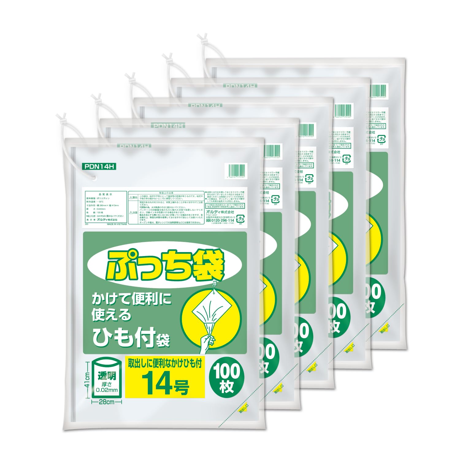 オルディ ビニール袋 キッチンポリ袋 食品保存袋 14号 ひも付き 透明 100枚入×5 縦41cm×横28cm 厚さ0.02mm 食品衛生法適合品 規格袋 ぷっち袋 PDN14H