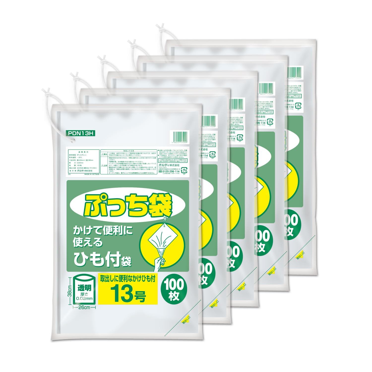 オルディ ビニール袋 キッチンポリ袋 食品保存袋 13号 ひも付き 透明 100枚入×5 縦38cm×横26cm 厚さ0.02mm 食品衛生法適合品 規格袋 ぷっち袋 PDN13H