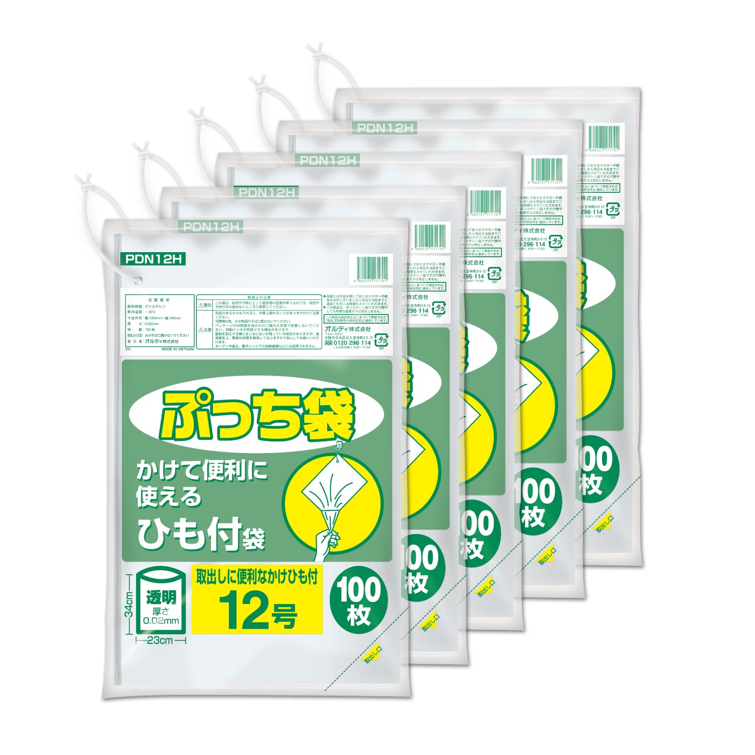 オルディ ビニール袋 キッチンポリ袋 食品保存袋 12号 ひも付き 透明 100枚入×5 縦34cm×横23cm 厚さ0.02mm 食品衛生法適合品 規格袋 ぷっち袋 PDN12H