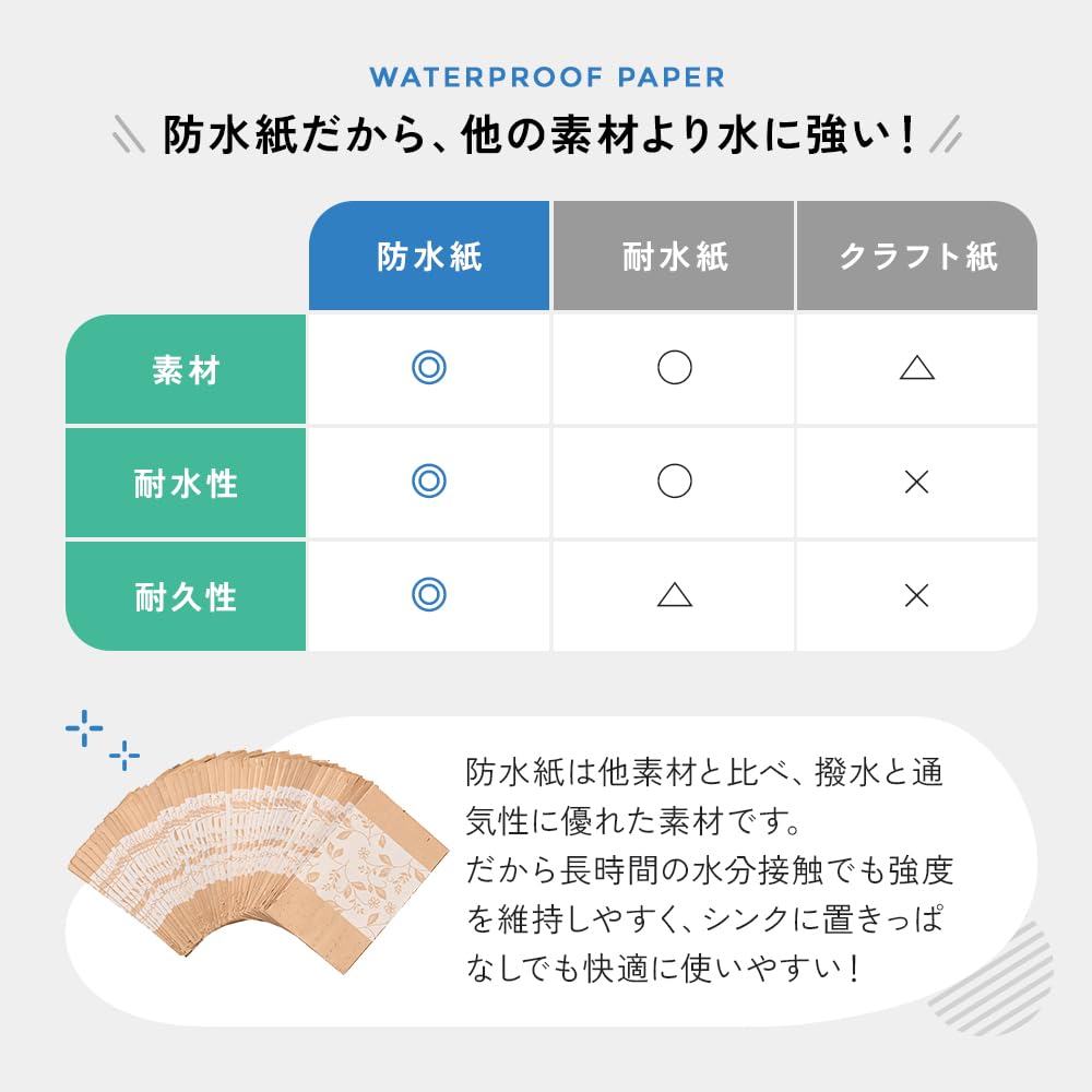 * 【丈夫な防水紙製】丈夫な防水紙を使用しているので、水に濡れたり、水気の多い生ゴミを入れても型崩れしにくく、破れにくい。開けたまま自立するから、調理中の野菜くずなども捨てやすく便利。