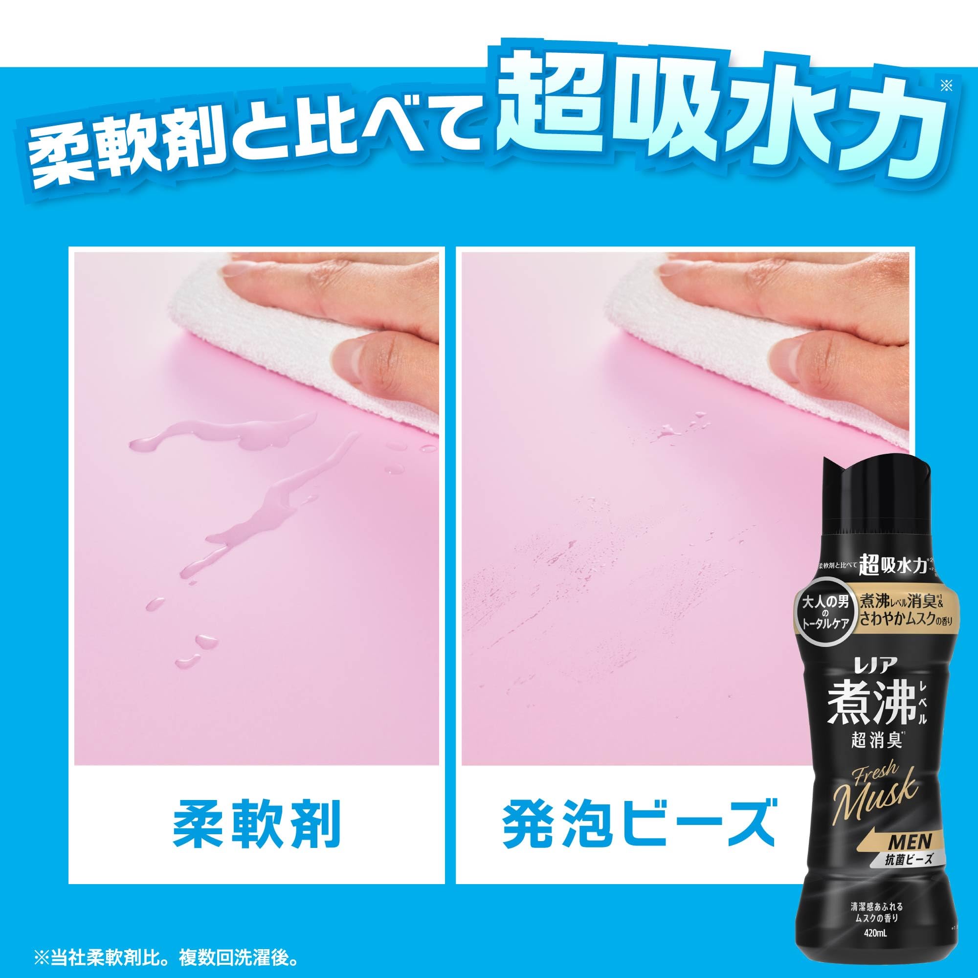 * 柔軟剤に比べて超吸水力* (*当社柔軟剤比。複数回洗濯後。)