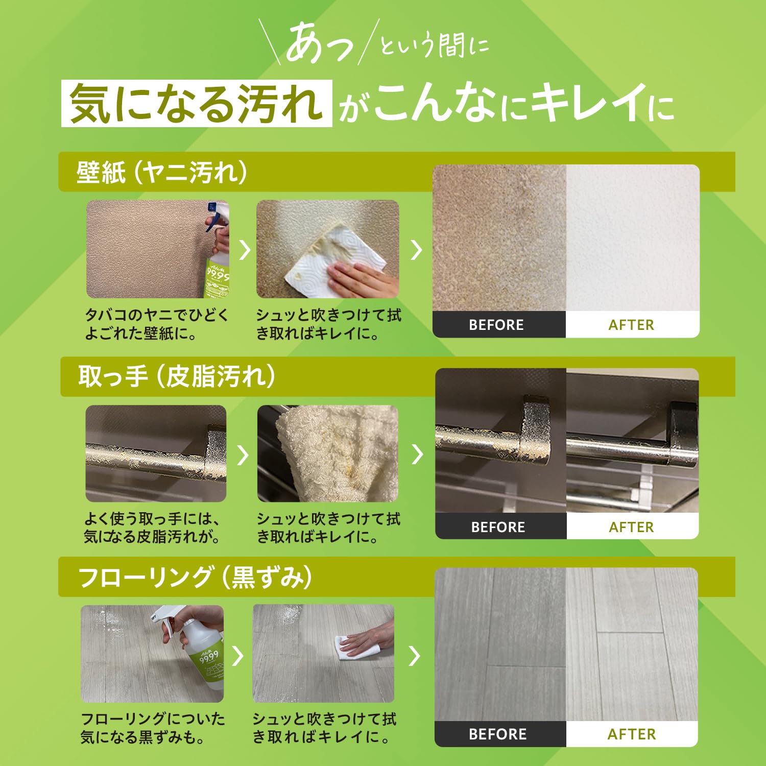 * 【色んな用途に使えて便利】フローリング、床、クロス、壁紙、車内、スマホなどの汚れ(黒ずみ、皮脂汚れ)を強力に分解・洗浄できます。タバコのヤニ汚れも効果的に落とすことができます。手袋いらずで、二度拭き不要なのでお掃除がラクチンに。