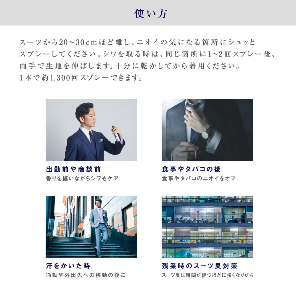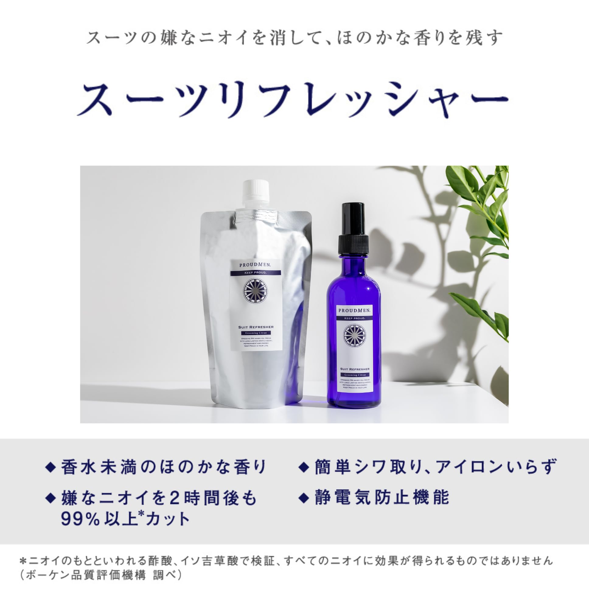 * シュッとひと噴きでスーツのニオイを一掃し、ほのかな香りが長時間持続するスーツリフレッシャー(グルーミング・シトラスの香り)の詰替用。シュッと噴きかけるだけで、スーツに染みついた汗やタバコ、食事などのイヤなニオイを元から消し去り、爽やかでほのかな香りだけを残します。シトラスの上品な爽やかさと深みを感じる洗練された「グルーミング・シトラス」の香り。