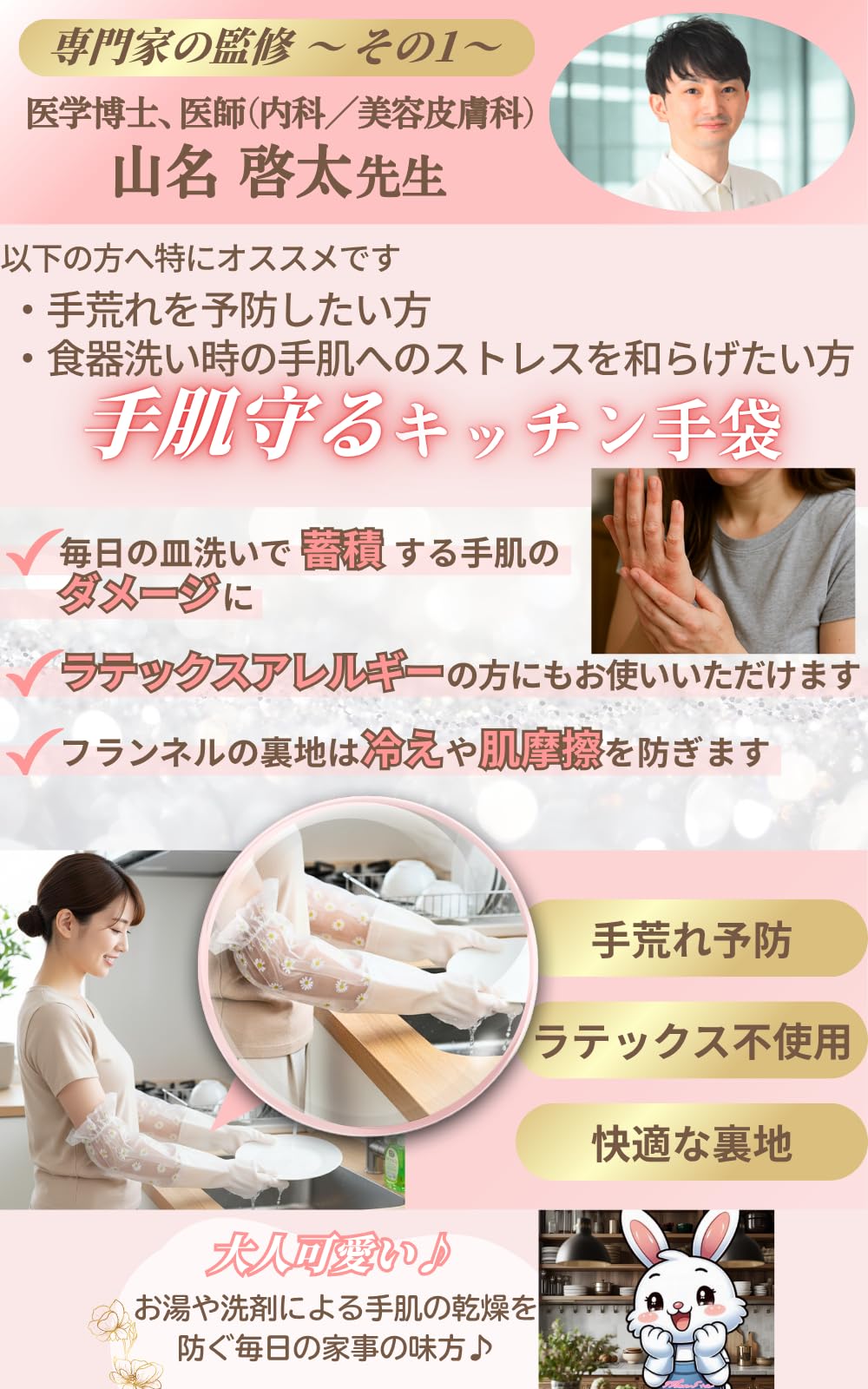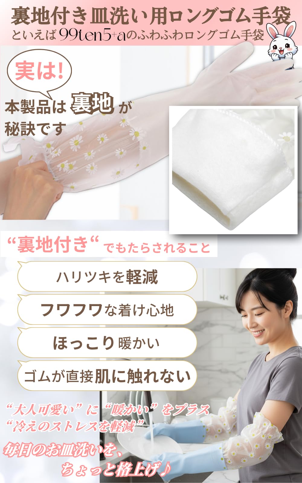 * 【③”ラテックスフリー”な使い心地】 ・敏感肌の方も安心してお使いいただけるよう、手袋部分はラテックスを含まないPVC素材を使用 ・洗剤やお湯からしっかりと手を保護しながら、かゆみやかぶれといったアレルギーの心配も軽減 ・どなたでも安心してお使いいただけます