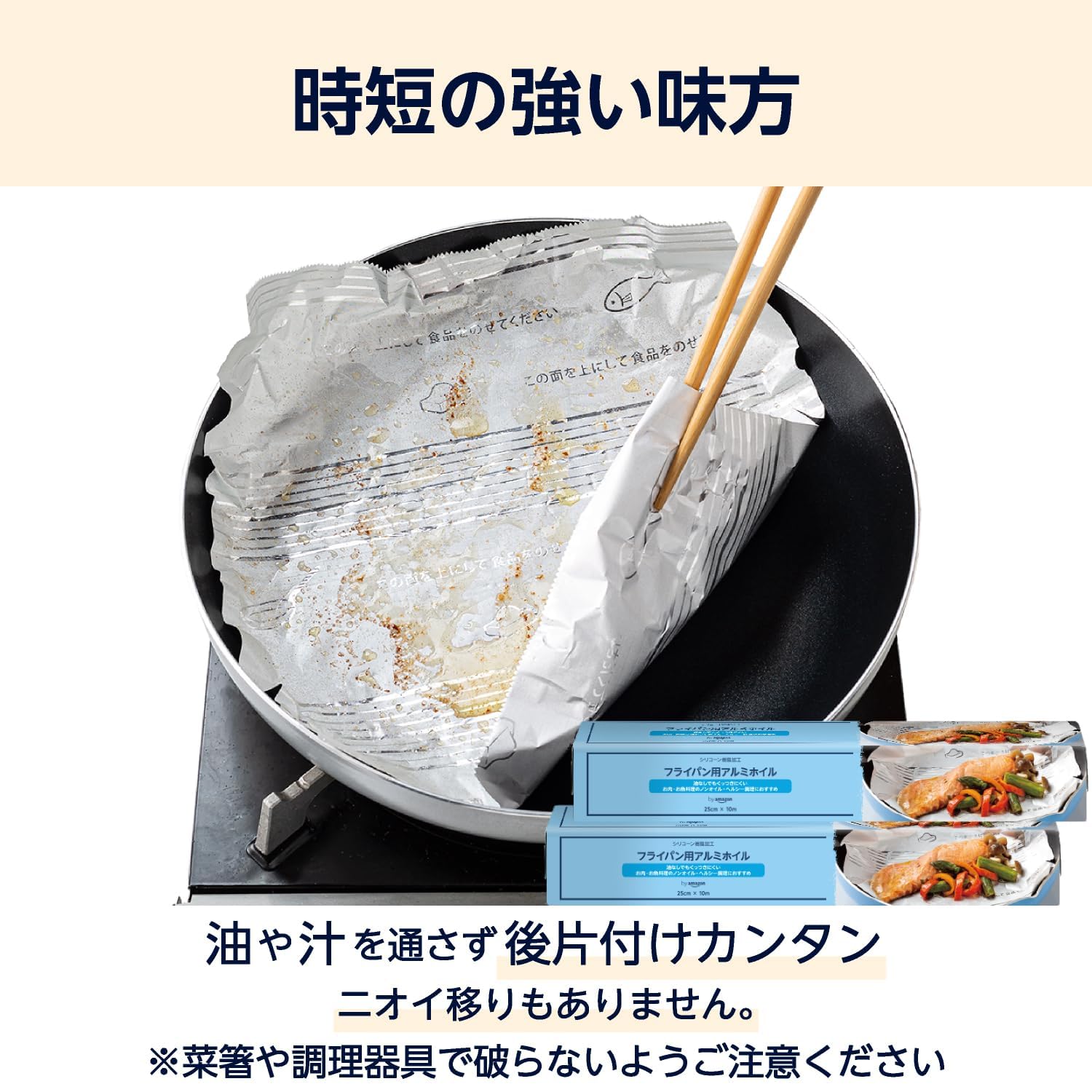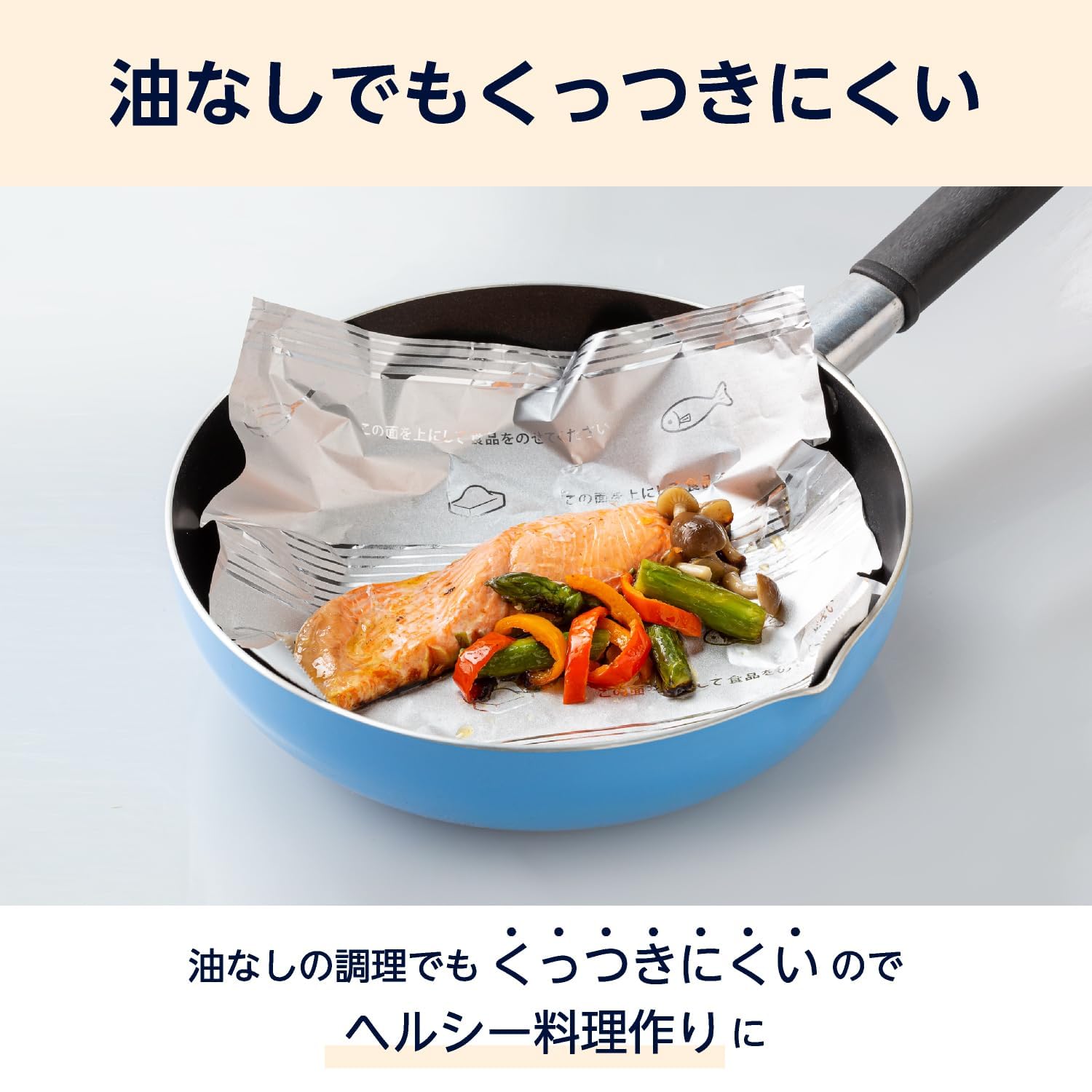 * 「」のフライパン用アルミホイルです。 シリコン塗布ホイルで油を使わなくても食材がくっつきにくいのでノンオイル・ヘルシー調理におすすめです。
