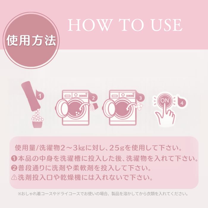* ・節水モードなど利用しない ・洗濯物の量を詰め込む等の場合、ビーズは最初に投入し、溶けやすくする。また、すすぎを2度利用いただく。 ・洗濯物の量が多い場合で最後に投入すると、洗濯物の隙間に入って溶け切らない場合があります。