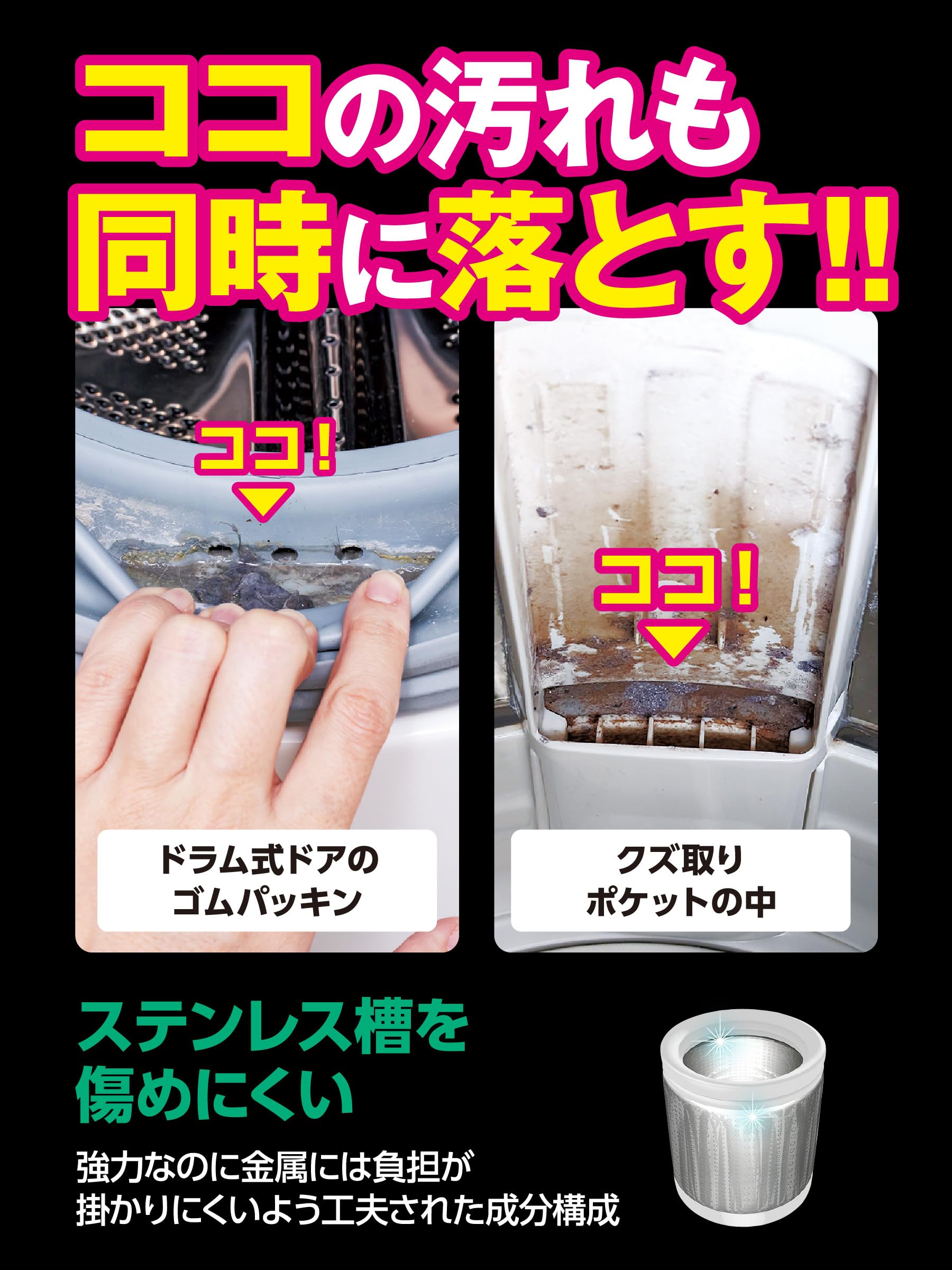 * 業務用レベルの超強力(*1)洗濯槽クリーナー。こびりついたカビ汚れ・悪臭・奥に潜む雑菌に。剥がれたカビも溶かし、カビ・菌・悪臭を根こそぎリセット洗浄(*2)します。6ヶ月に一度の使用がおすすめ。