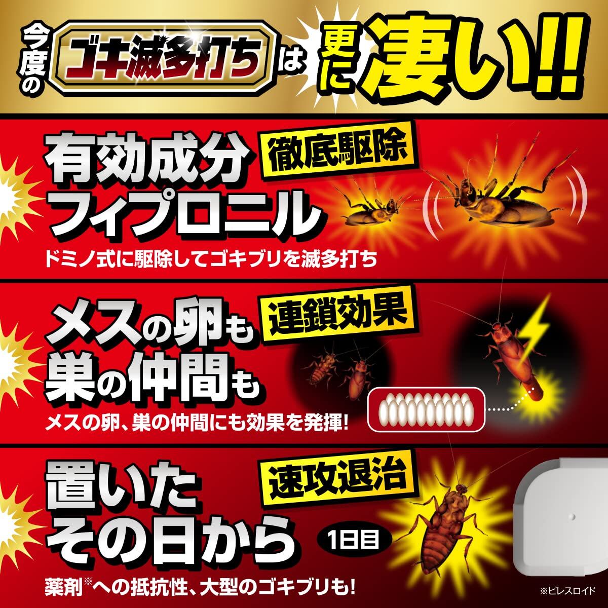 * 【巣ごと根こそぎ駆除】 ゴキブリ の体内に有効成分が入り込み、1匹を介して巣の ごきぶり にも連鎖し効果を発揮。エサを食べたゴキブリのフンやその死骸を食べたゴキブリ、メスのゴキブリが身体に持っている卵など産卵前や羽化前の状態にも効果的。