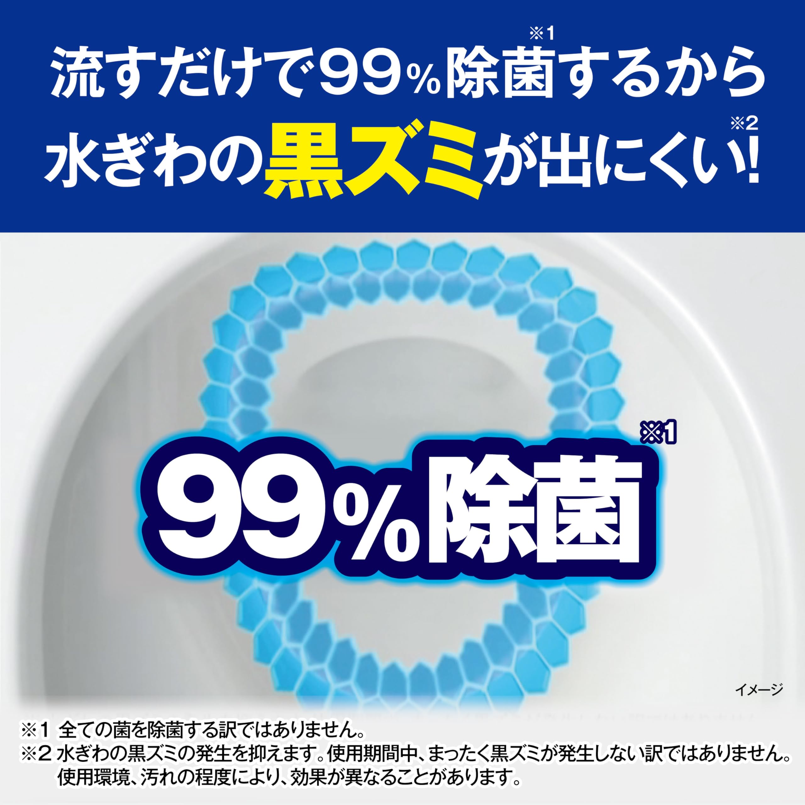 * 除菌率99%*1で、水ぎわの黒ズミの発生を抑え*2、トイレ掃除を減らせます。*1 水ぎわの黒ズミ原因菌への効果。全ての菌を除菌する訳ではない。当社の実験室内の検証結果による。*2 使用期間中、まったく黒ズミが発生しない訳ではない。