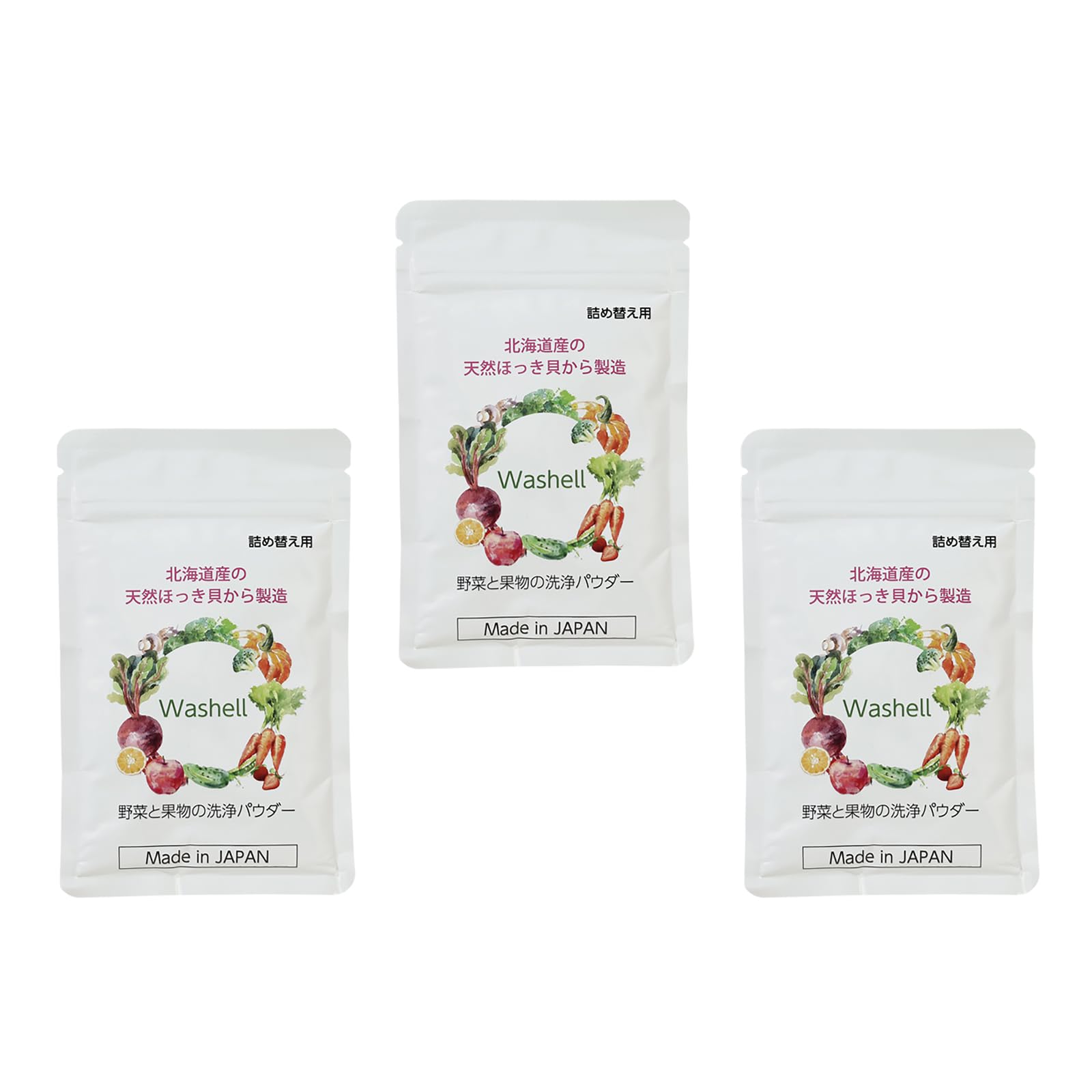 【詰替え用】Washell (ウォッシェル) ホタテ貝より効果のある ほっき貝から出来た 野菜 果物 洗浄 除菌 鮮度保持 パウダー (詰替え用3個)