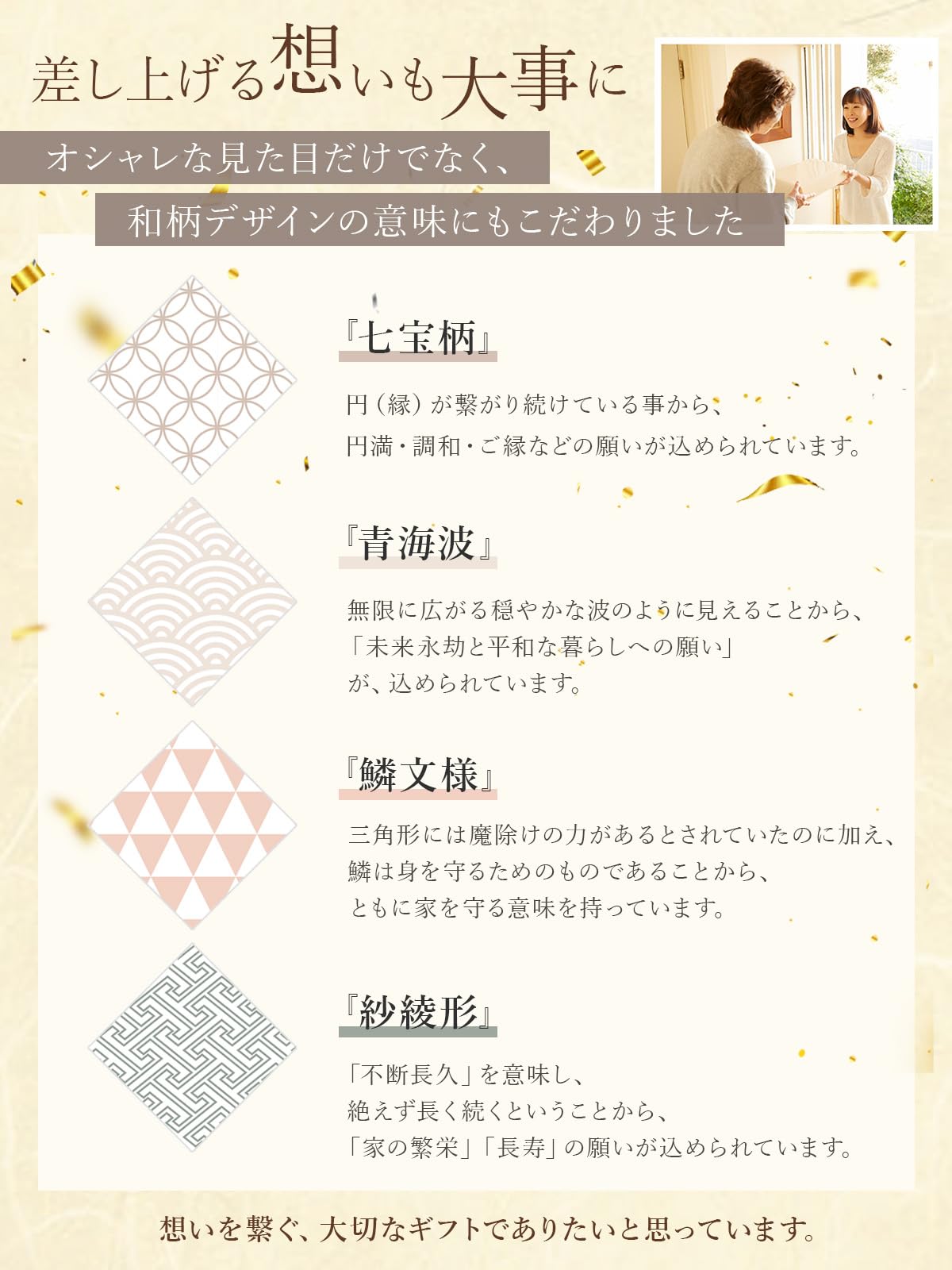 * 【柄の意味にもこだわったパッケージ】 こだわってオリジナルで作成したモダン和柄のパッケージは、「ご縁、穏やかな暮らし、家を守る、繁栄」などの意味を持つ伝統柄を現代的にアレンジ。引っ越しのご挨拶に、温かい想いがしっかり伝わるよう仕上げました。