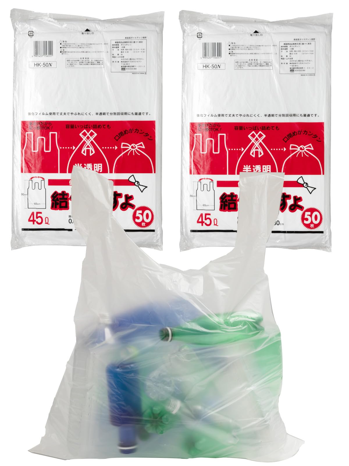 ケミカルジャパン ごみ袋 手提げ 半透明 100枚 (50枚×2個セット) 横65cm 縦80cm 厚さ0.02㎜ 便利なポリ袋 45L 結べますよ HK-50N