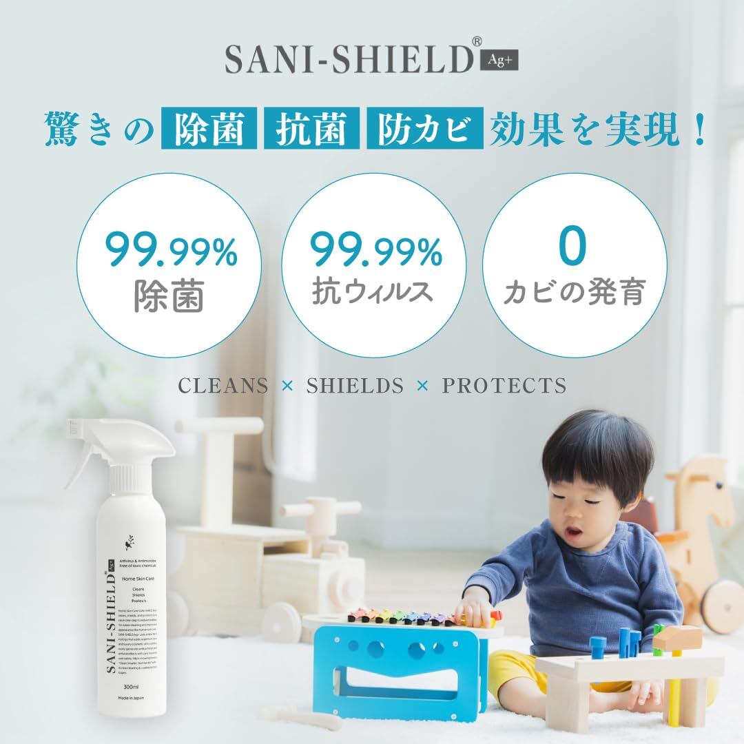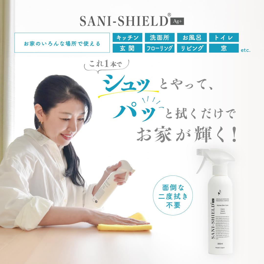 SANI-SHIELD サニーシールドAg+ 除菌スプレー クリーナー 中性 抗菌コーティング ウィルス 花粉 消臭 防カビ お掃除 洗浄 撥水 艶 ツヤ 手に優しい 古堅純子 銀イオン ペット臭 日本製 トリガー1本+詰替1袋+スクラブ1本 サボン