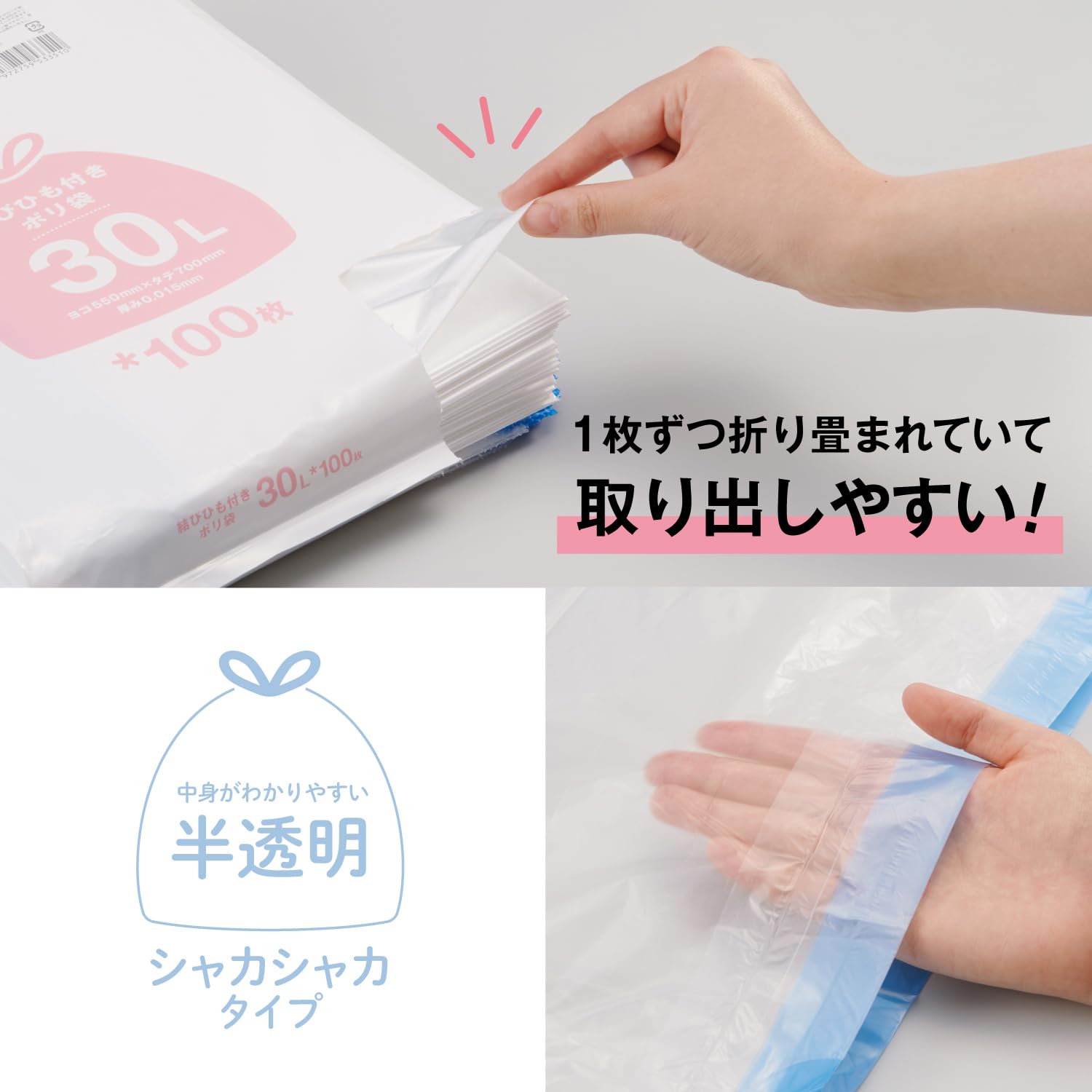 オルディ ごみ袋 結びひも付き 30L 半透明 100枚入 ギリギリまで物を入れられる 1枚ずつ取り出しやすい 持ち運び便利 収納袋 DT-HN30-100