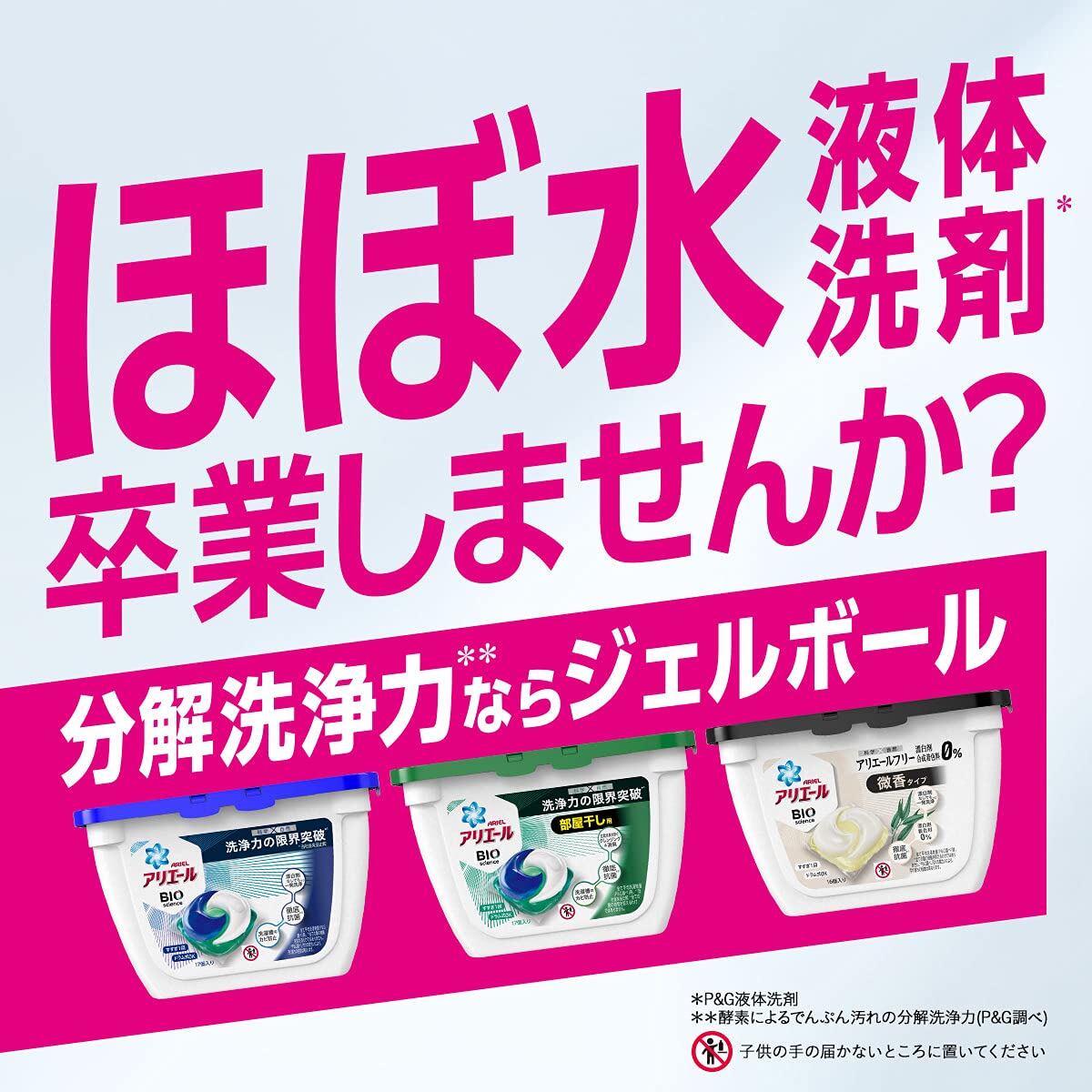 * 科学と自然の力で大改良アリエールバイオサイエンス。科学の洗浄力と自然の分解力で洗浄力の限界突破*。落ちにくいえりソデ汚れもしっかり落とします。*P&G従来品比較