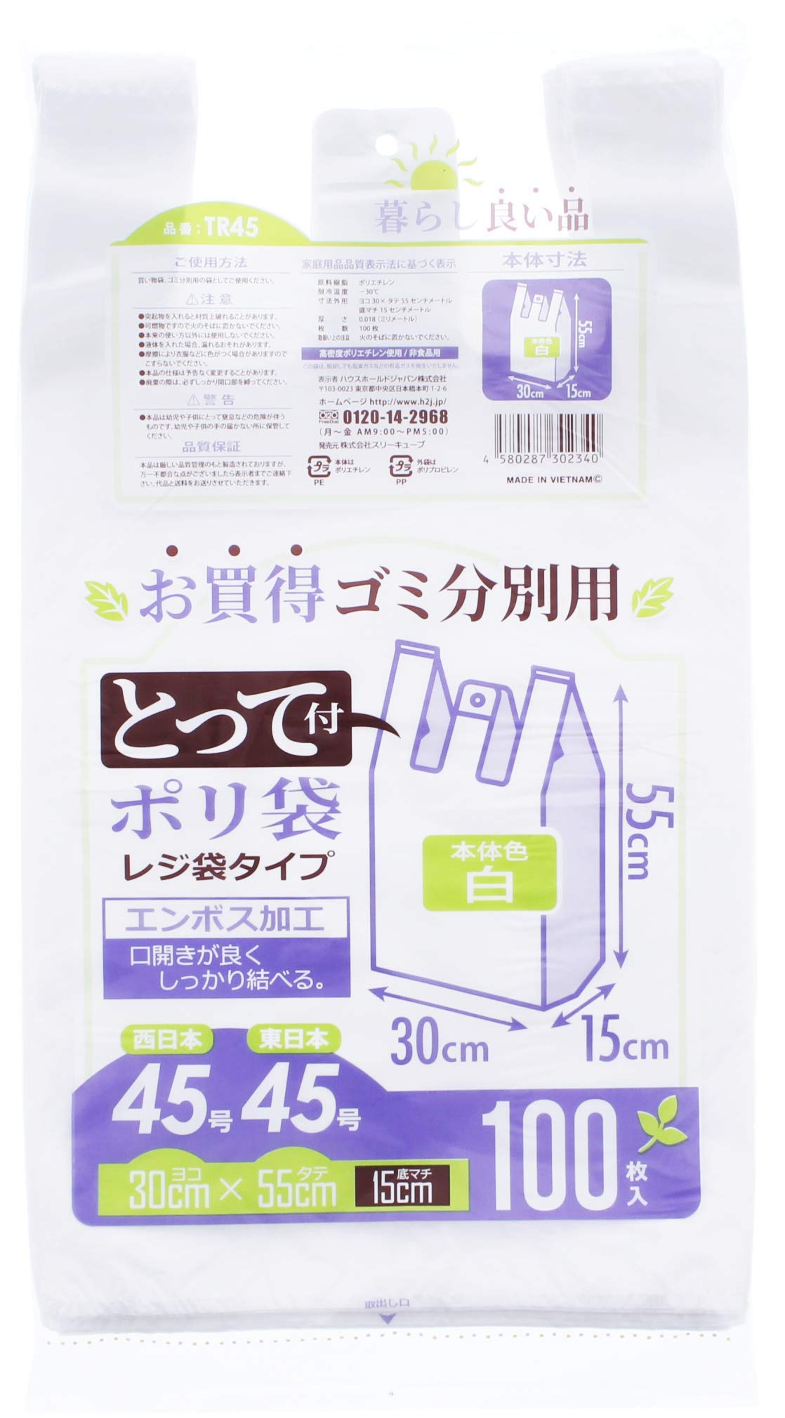 スリーキューブ レジ袋 とって付 ゴミ分別用ポリ袋 100枚入 10個パック 白 約30×55×マチ15cm TR45