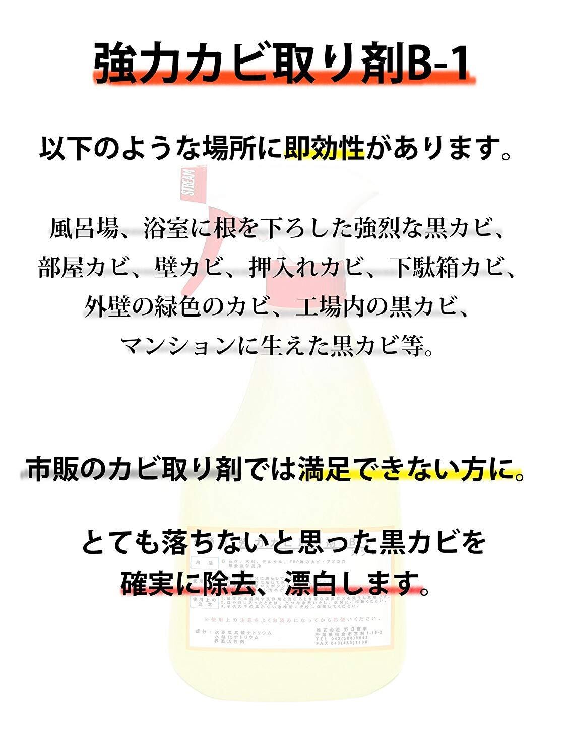 * 【使用例】以下のような場所に即効性があります。風呂場、浴室に根を下ろした強烈な黒カビ、部屋カビ、壁カビ、押入れカビ、下駄箱カビ、外壁の緑色のカビ、マンションに生えた黒カビ、調理場や工場に生えた黒カビ等。