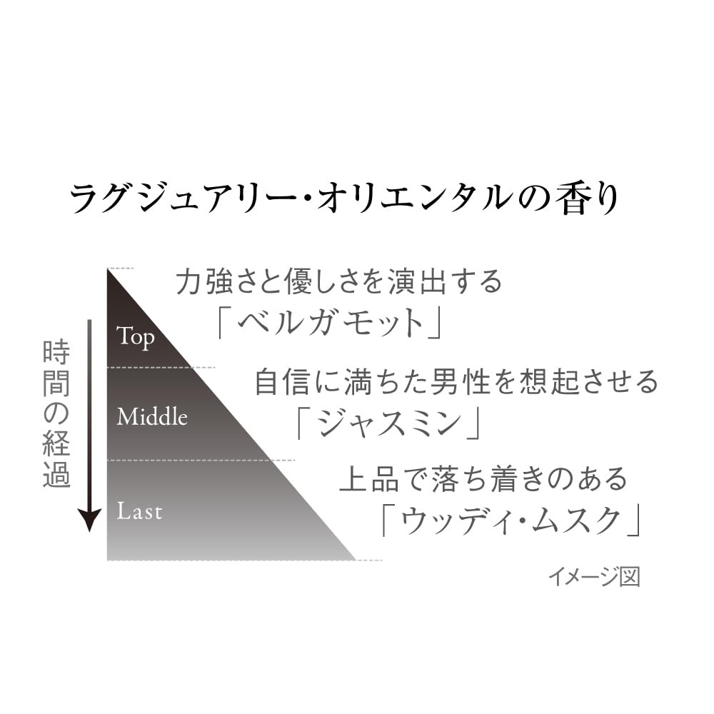 * 【香水未満の「ほのかな香り」】男の色気を感じさせる上品で奥深い「ラグジュアリー・オリエンタル」の香り。トップノートからラストノートまで、時間の経過とともに香りの変化が楽しめます。