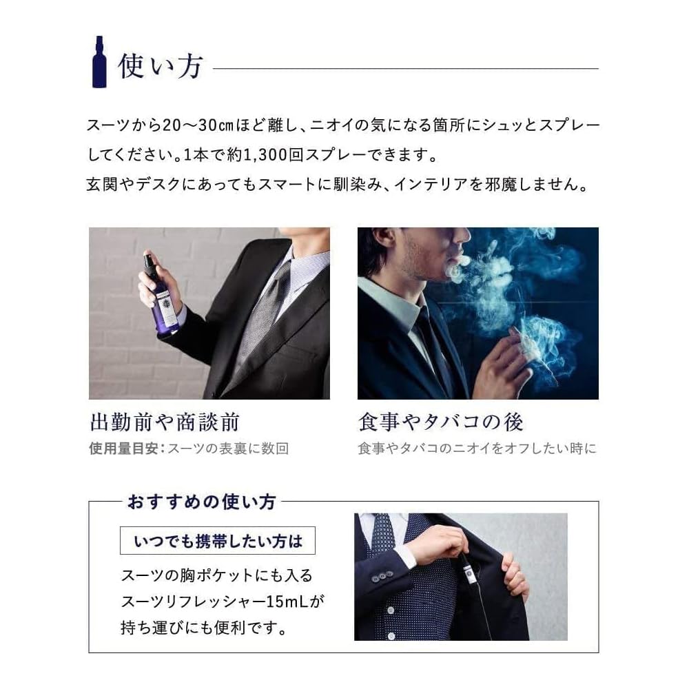 * 【使い方】出勤前や商談前、食事やタバコの後にスーツから20~30cmほど離し、ニオイの気になる箇所にシュッとスプレーしてください。