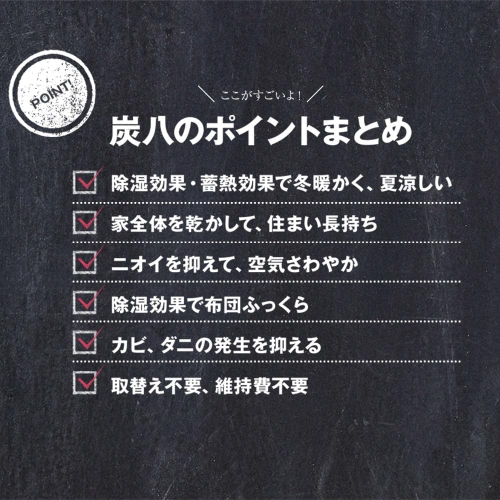 * ・炭八は春夏秋冬、四季の変化と共に移りかわる湿度を調節 ・窓枠や壁材の結露防止、結露対策、湿気対策にも効果あり ・使い捨ての除湿剤、脱臭剤や乾燥剤のように買替、取替の手間がなくゴミの軽減にも ・お手入れは定期的に天日干しをするだけ ・除湿器、加湿器のように電気代がかからず環境にやさしい湿気取り(湿気とり)、調湿グッズです ・ホルムアルデヒドなどの化学物質を吸着、芳香剤のように余計な香りがしない、無臭の脱臭炭です ・薬剤不使用、ペットやお子様がいる家庭でも安心してお使いいただけます ・炭八で住まい(住居)の悩みを軽減、健康的でサスティナブルな暮らし