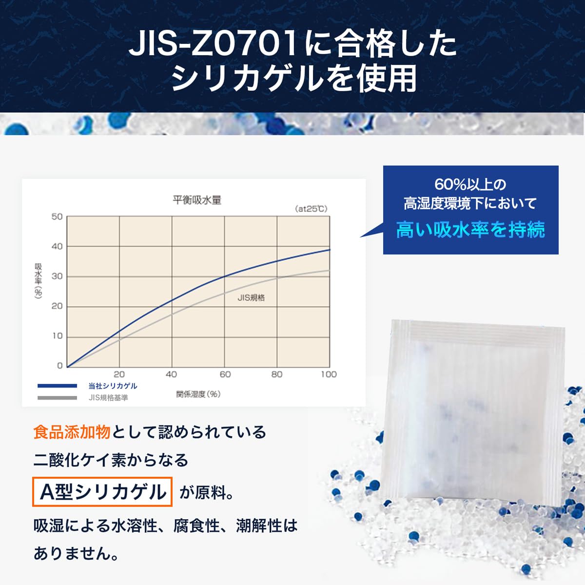 * 【製品特徴】 ・食品添加物として認められている二酸化ケイ素からなる「A型シリカゲル」が原料なので安心 ・吸湿による水溶性・腐食性・潮解性はありません。・吸湿度域でも吸湿に優れています。 ・吸湿状態が分かりやすい青色ゲル入り。 ・一定吸湿するとピンク色に変化します。 ・レンジで加熱すると何度も使用可能 ・湿気に強いアルミ蒸着袋入りです。 ・何度も開封可能なチャック付