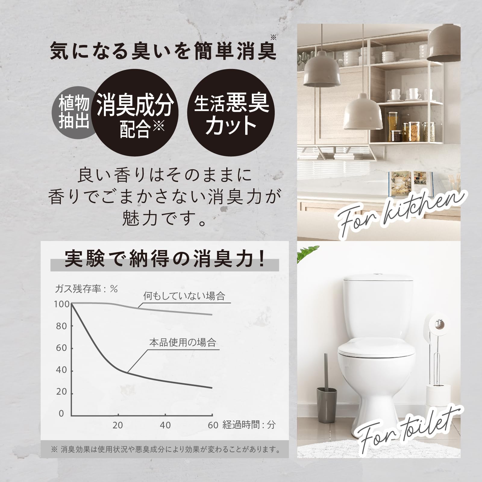 * 植物抽出消臭成分を配合。良い香りはそのままに、香りでごまかさない消臭力が魅力。生活の気になる悪臭をカットするルーム&ファブリックミスト