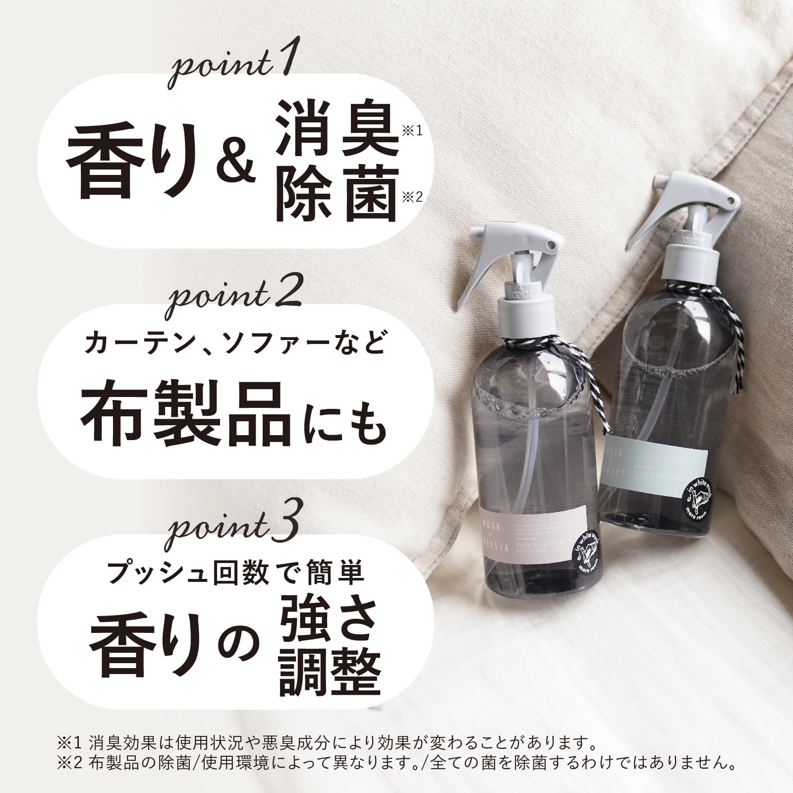 * 空間だけでなく、洗えないカーテンやソファーなどのファブリックに使えばしっかり除菌もしてくれる