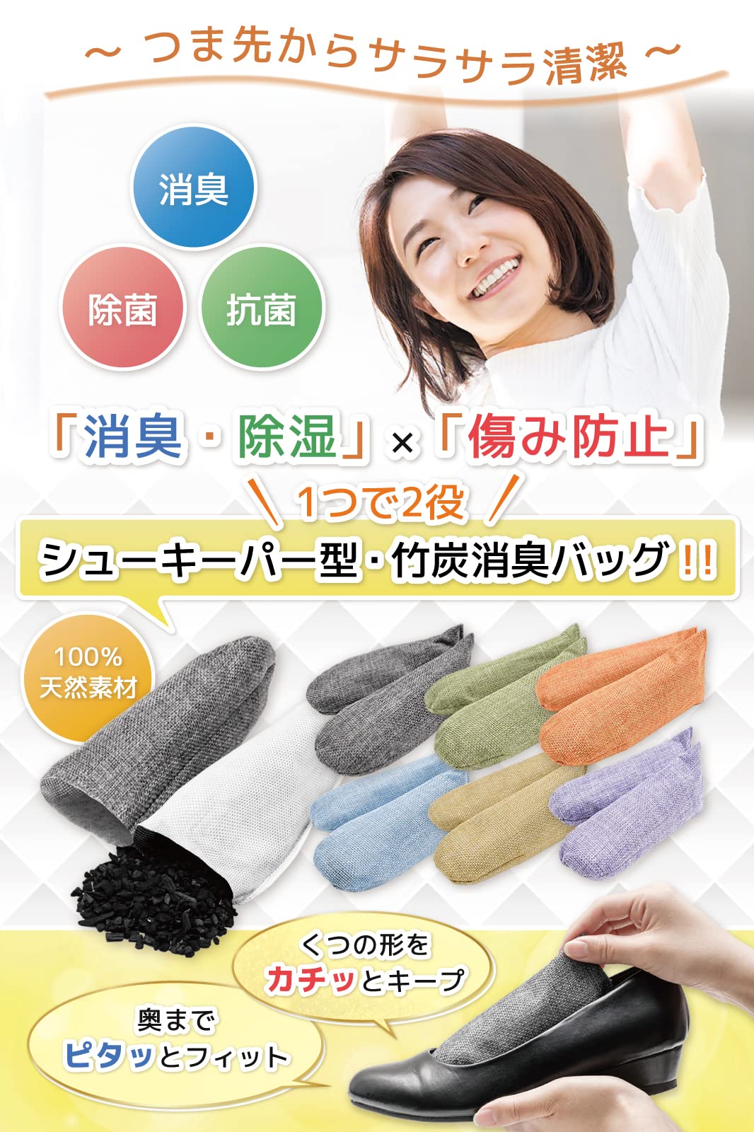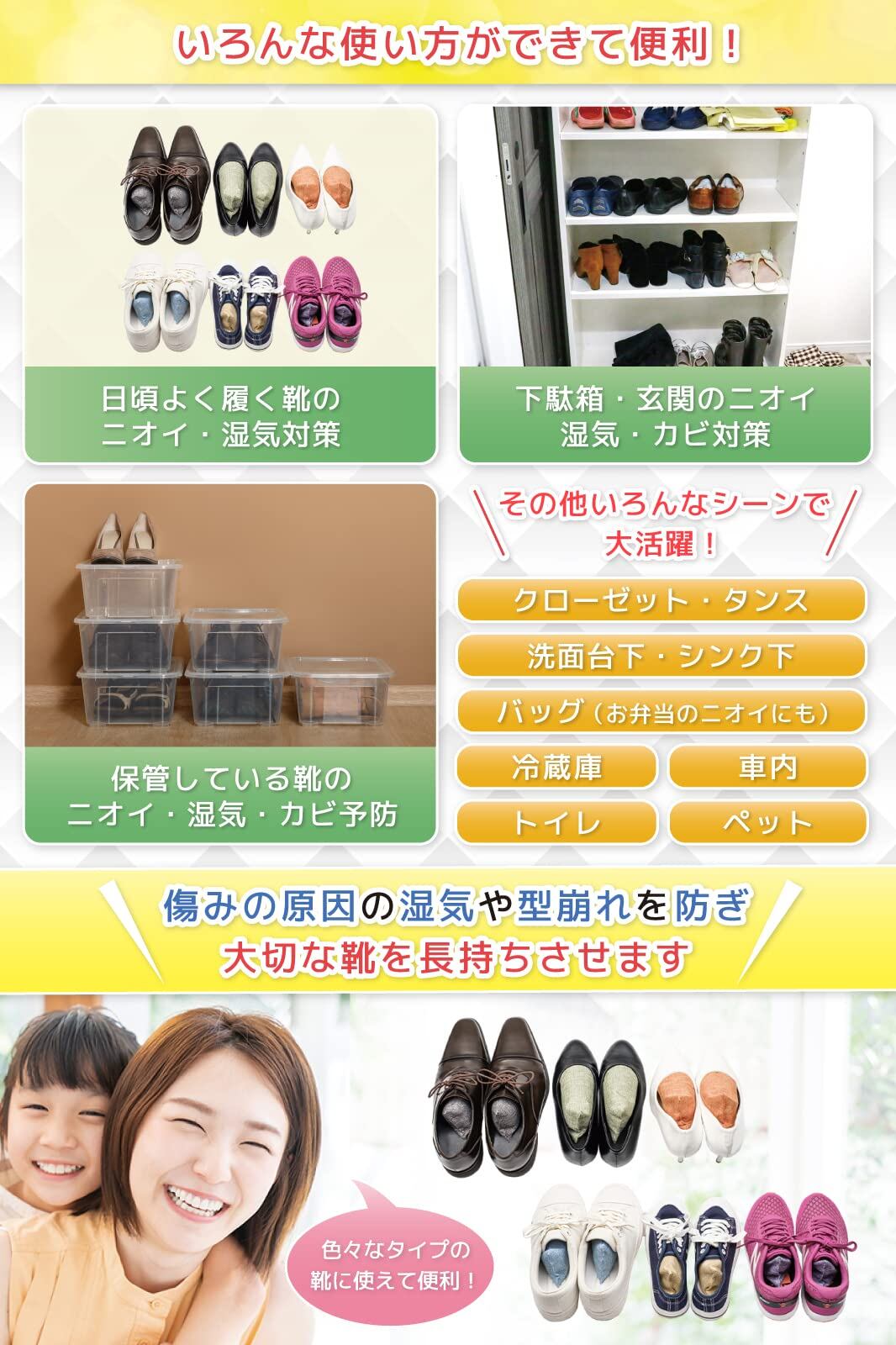 * 【いろんなシーンで大活躍】シューキーパー 型なので、靴の形にピッタリフィットし、つま先までしっかり 清潔 で 型崩れ を防ぎます。靴 乾燥剤 消臭剤 以外でも、靴箱 下駄箱 タンス クローゼット 衣装ケース お弁当などを入れたバッグ スーツケース 車 ペット トイレ 洗面台下 シンク下 冷蔵庫 ロッカー などにのさまざまな気になる場所に効果を発揮し、ポンと置くだけで使い方も超カンタン。