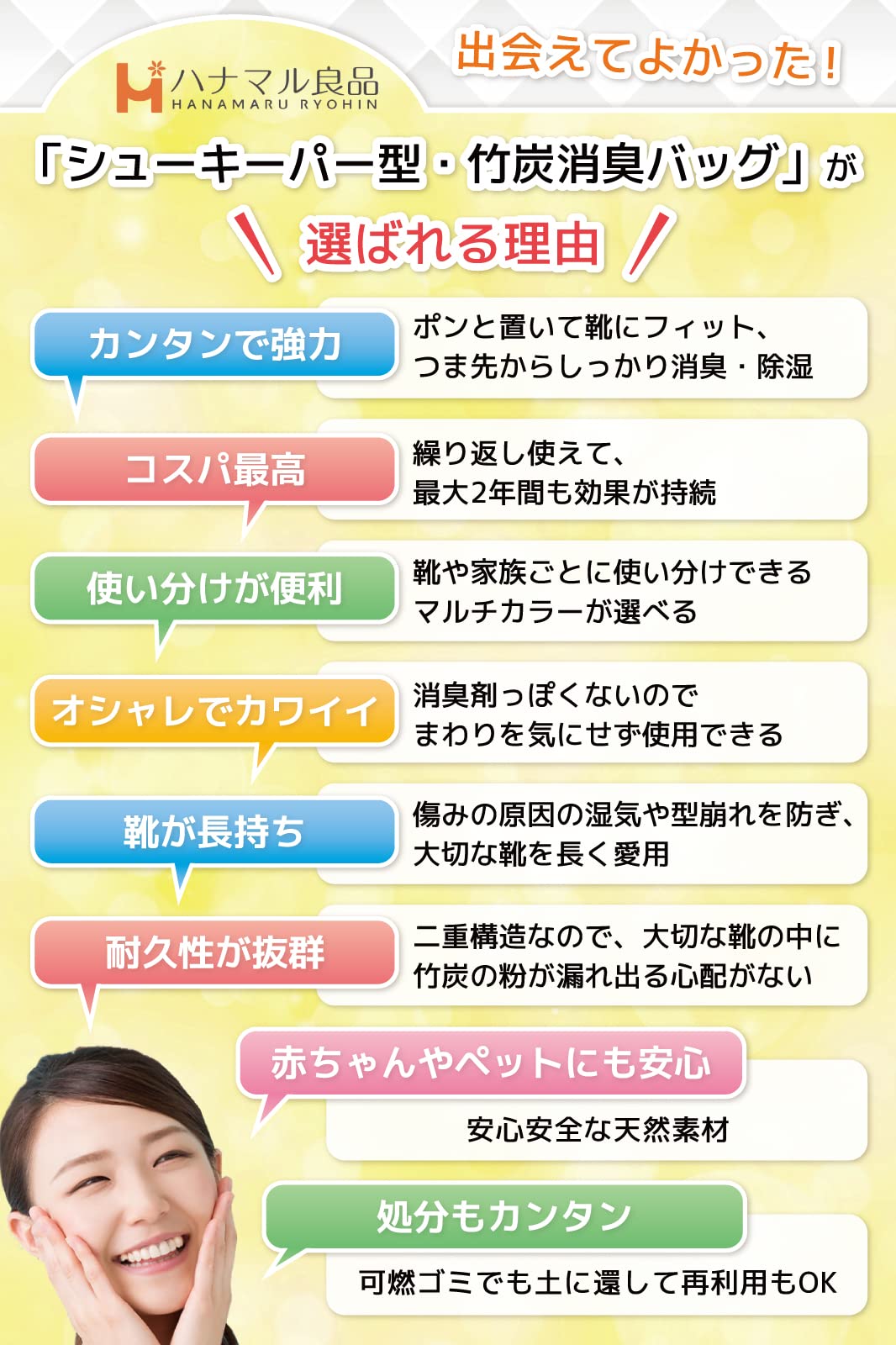 * 【消臭・除湿・抗菌 ニオイのモトから根本除去】 ハナマル良品の竹炭バッグは、 消臭 脱臭 除湿 効果を最大限に発揮するため、厳選された高品質の優れた竹炭のみを使用!木炭や備長炭の10倍の吸着力でニオイのモトから根本除去!天然の竹炭ですので、香でごまかす 消臭剤 とは違い、 無臭 でイヤなニオイと混ざることなく自然で爽やかな環境でご使用いただけます。また、 調湿 効果にも優れており 除湿剤 としても最適です!空気中のニオイ物質や水分を吸着し、空気の清浄と雑菌の繁殖を防ぐ 抗菌 作用!