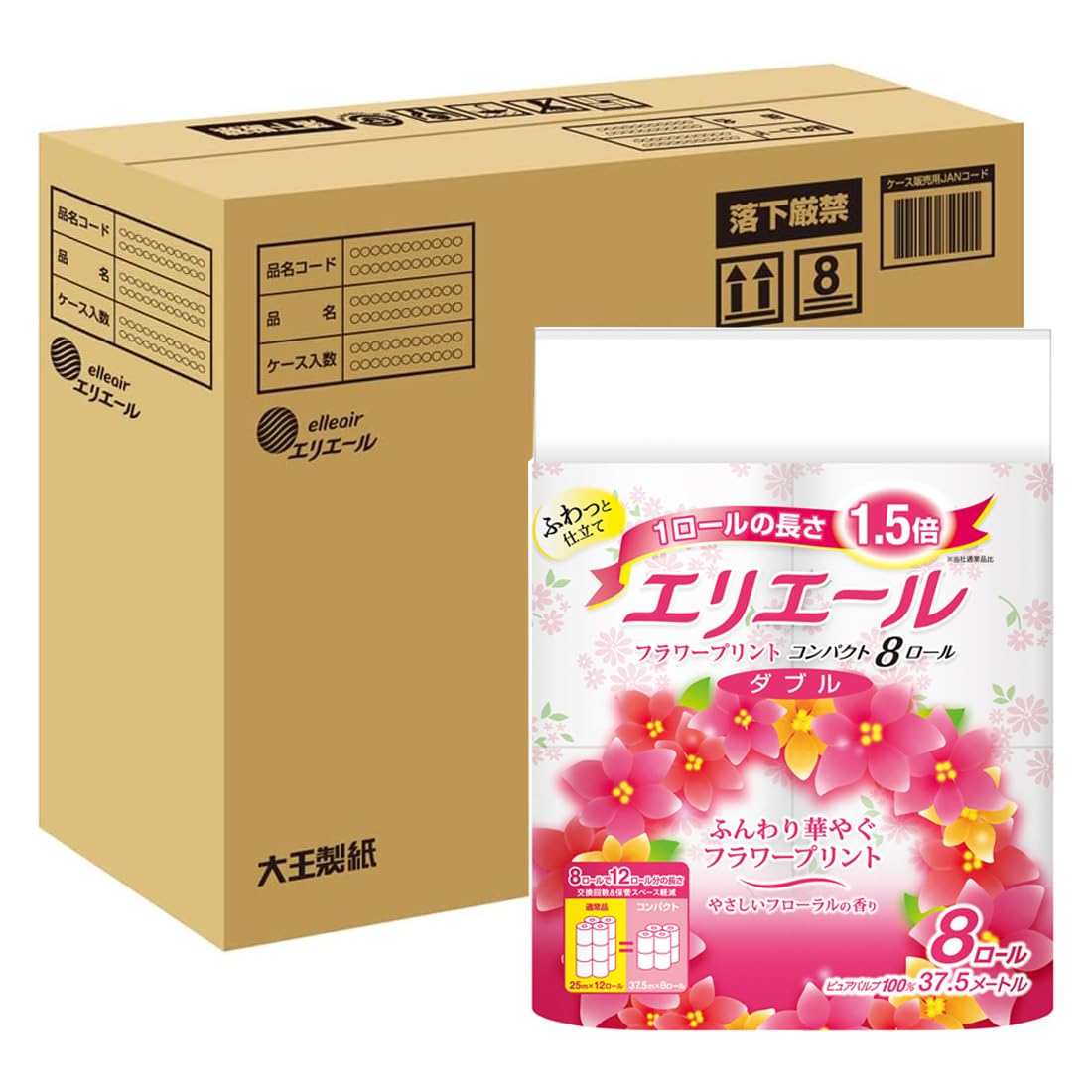 エリエール トイレットペーパー フラワープリント 1.5倍巻き 37.5m×32ロール(8ロール×4パック) ダブル パルプ100% 優雅な花の香り 【EC限定 正規段ケース】 【ハーフケース】 | [限定] まとめてお得便